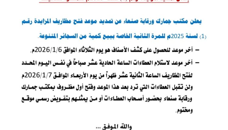 يعلن مكتب جمارك ورقابة صنعاء عن تمديد موعد فتح مظاريف المزايدة رقم (1) لسنة 2025م للمرة الثانية الخاصة ببيع كمية من السجائر المتنوعة.