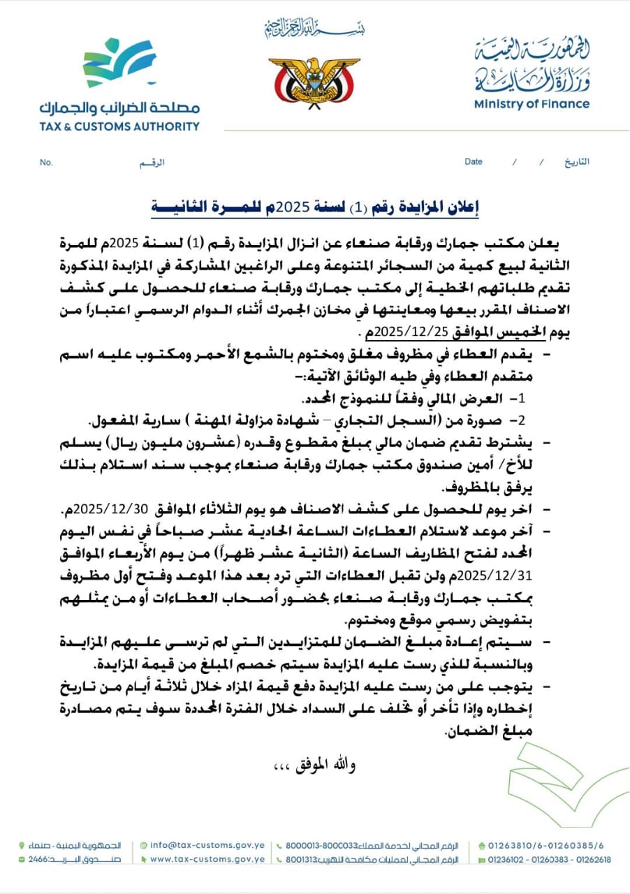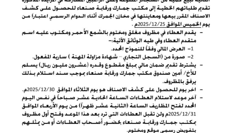 يعلن مكتب جمارك ورقابة صنعاء عن إنزال المزايدة رقم (1) لسنة 2025م للمرة الثانية لبيع كمية من السجائر المتنوعة وعلى الراغبين المشاركة في المزايدة المذكورة تقديم طلباتهم الخطية الى مكتب جمارك ورقابة صنعاء للحصول على كشف الأصناف المقرر بيعها ومعاينتها في مخازن الجمرك اثناء الدوام الرسمي اعتبارا من يوم الخميس 25/12/2025م.