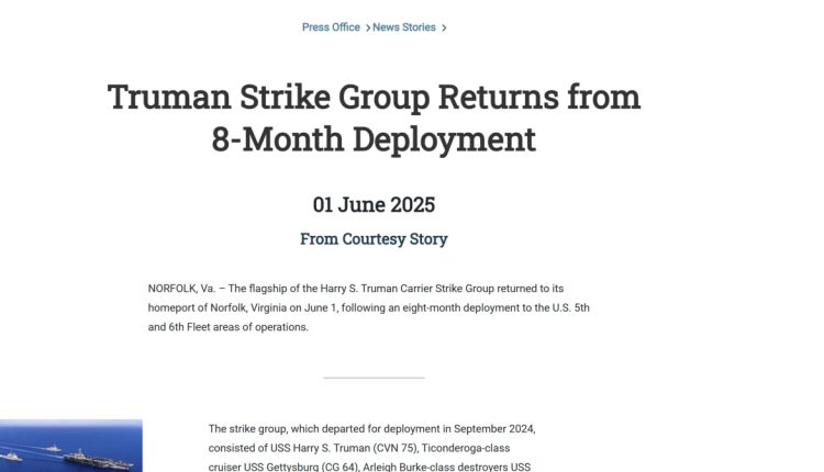 عادت حاملة الطائرات الأمريكية “هاري إس ترومان” إلى قاعدتها في نورفولك بولاية فرجينيا، بعد مهمة استمرت أكثر من ثمانية أشهر شهدت انتكاسات عسكرية وخسائر مادية كبيرة، رغم محاولات الإعلام الأمريكي تصويرها كـ”نجاح عملياتي”.