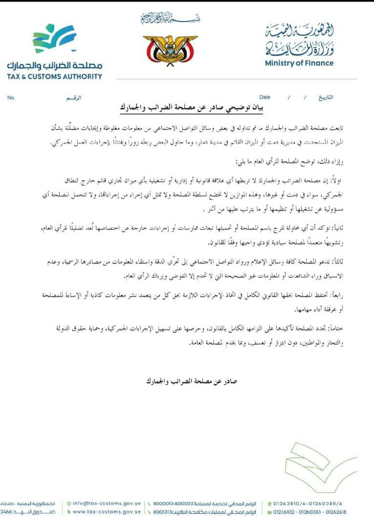 • بيان توضيحي صادر عن مصلحة الضرائب والجمارك
