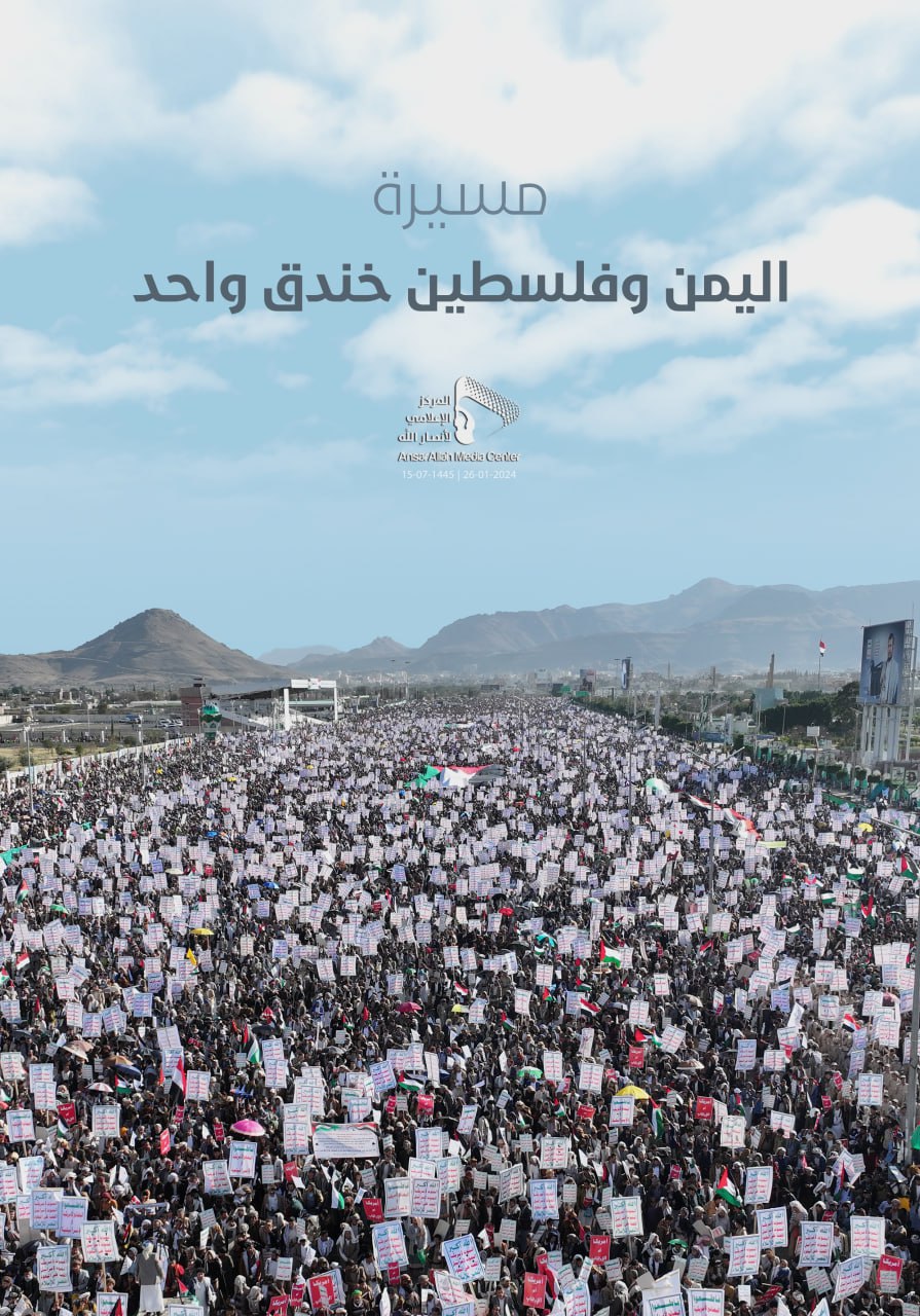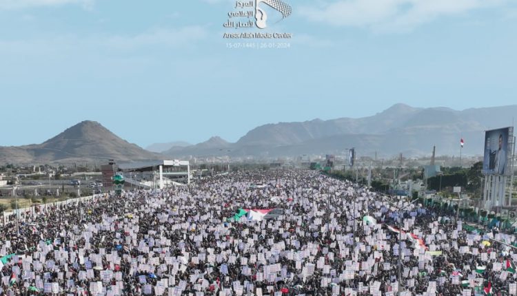 ورفعت الحشود آلاف الافتات التي كتب عليها شعار البراءة من الأعداء “الله أكبر، الموت لأمريكا، الموت لإسرائيل، اللعنة على اليهود، النصر للإسلام”، مؤكدة أن معركة اليمن في البحر الأحمر هي لإسناد الشعب الفلسطيني.