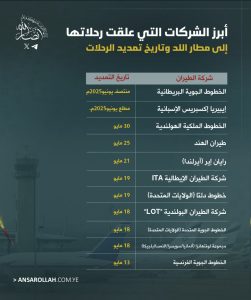 منذ لحظات وصول الصاروخ اليمني إلى قلب مطار اللد في فلسطين المحتلة، علقت عشرات شركات الطيران العالمية رحلاتها إلى كيان العدو، ثمّ جدّدت هذه الشركات التمديد إلى فترات تتجاوز هذا الشهر.