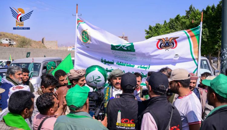 وانطلق موكب ضيوف رسول الله من أبناء المحافظات الجنوبية من جولة الثقافة بالعاصمة حاملين لافتات تجسد تمسك الشعب اليمني بقيم وتعاليم ونهج الرسول الأعظم، وصولاً الى ميدان السبعين.