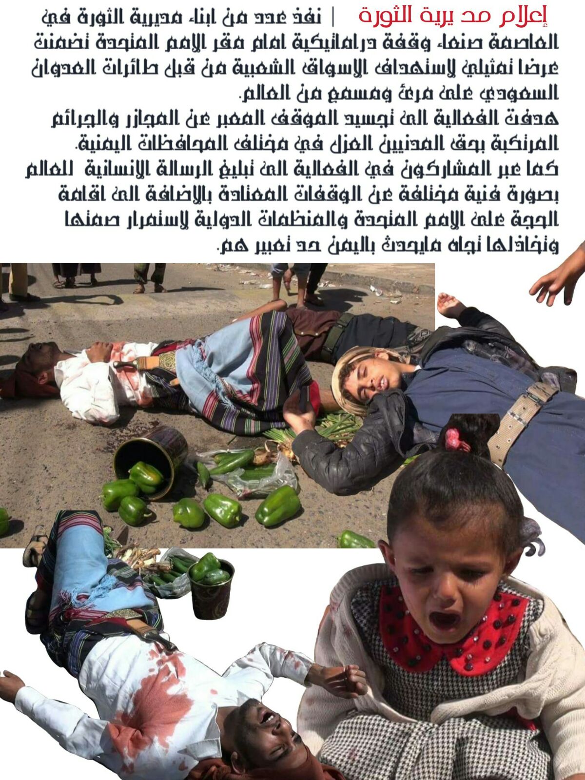 نفذ عدد من أبناء مديرية الثورة في العاصمة صنعاء اليوم الأحد 8 نوفمبر 2015م وقفة احتجاجية دراماتيكية أمام مقر الأمم المتحدة تضمنت عرضا تمثيلي لحالة الوضع الذي يسود الأسواق الشعبية أثناء قصفها من قبل طائرات العدوان السعودي وعلى مرئ ومسمع من العالم.