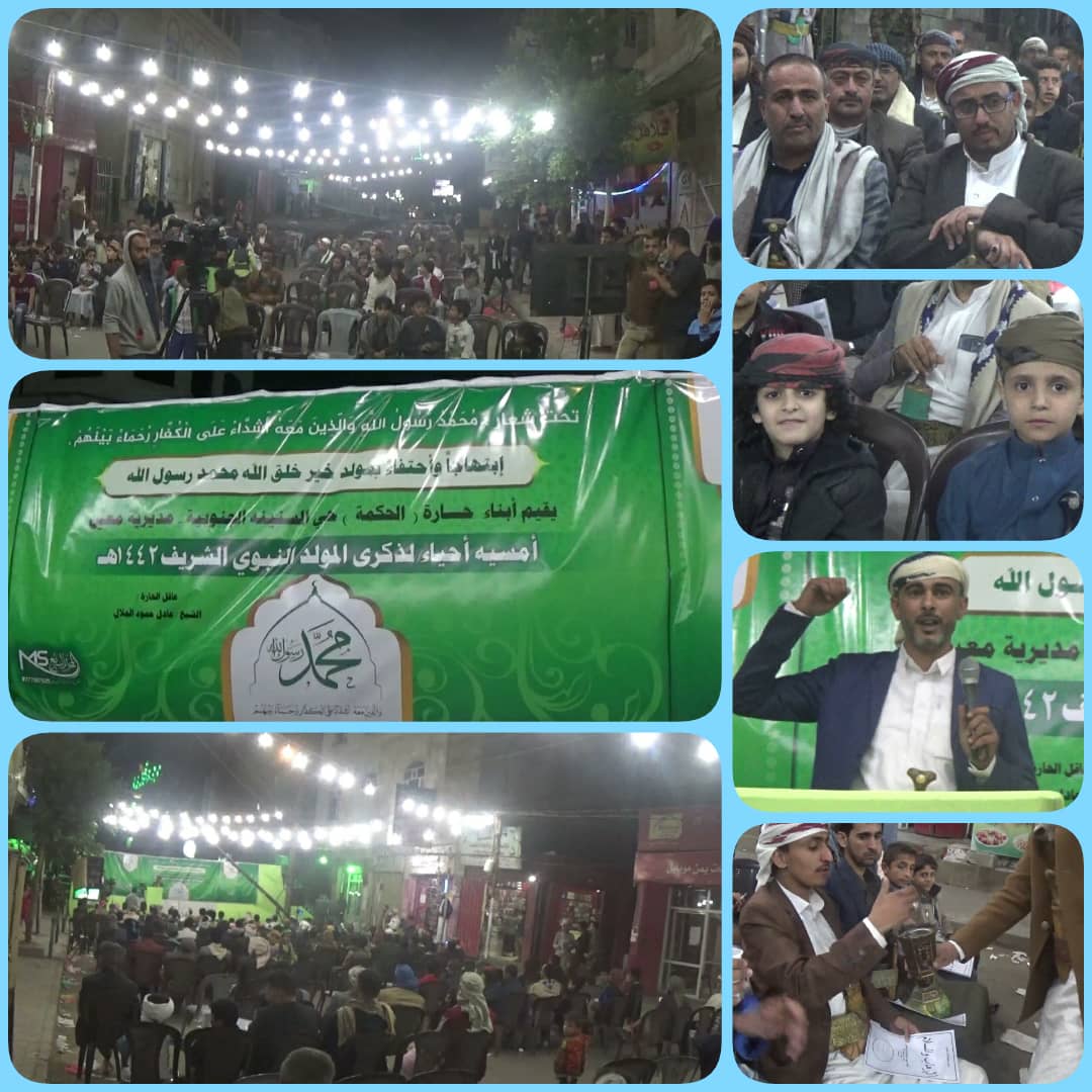 تدشينا لفعاليات المولد النبوي الشريف بمديرية معين بالأمانة أقيمت مساء اليوم أمسيات فنية وخطابية في مختلف أحياء المديرية.