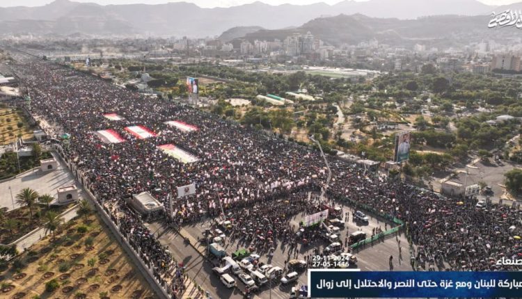 شهدت العاصمة صنعاء اليوم الجمعة، خروجا مليونيا في مسيرة “مباركة للبنان ومع غزة حتى النصر والاحتلال إلى زوال” تأكيداً على استمرار دعم ونصرة الشعب الفلسطيني ومقاومته الباسلة.