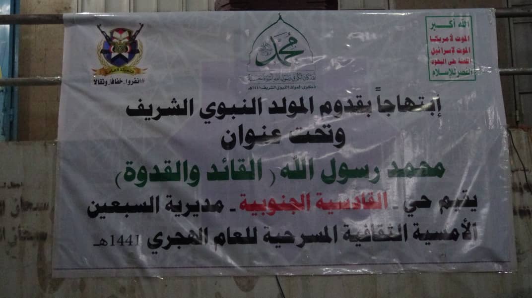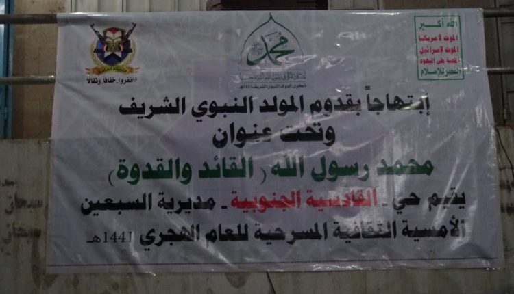 ابتهاجا بقدوم المولد النبوي الشريف لعام 1441ه نظم أبناء حي القادسية الجنوبية بمديرية السبعين أمسية ثقافية وشعرية ( ليلية ) بحضور عدد من الضيوف وفي مقدمتهم المشرف العام للمديرية أبو مطهر الوشلي وعدد من أبناء ووجهاء وشخصيات الحي والأحياء المجاورة وقد تخللت الأمسية بداية بأيات من الذكر الحكيم تلاه النشيد الوطني وشعر وعدد من الفلاشات والاسكاتش جميعها تتحدث عن فرحة وابتهاج اليمنين بقرب ذكرى المولد النبوي الشريف وتأتي هذه الأمسية ضمن فعاليات وأنشطة ينظمها المجلس المحلي والأشرافي بمديرية السبعين في جميع الأحياء.