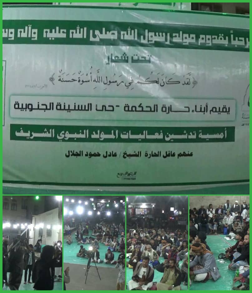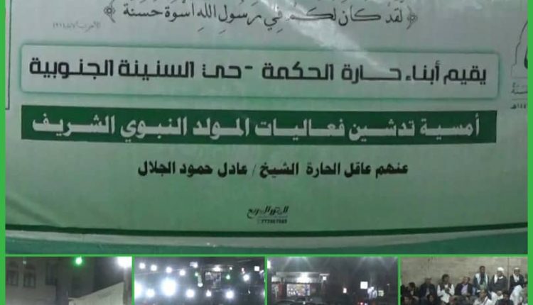 أقام أبناء حارة الحكمة بحي السنينة الجنوبية بمديرية معين بالأمانة أمسية فنية وخطابية وذلك تدشينا لفعاليات المولد النبوي الشريف للعام 1441 – 2019.  وبعد افتتاح الأمسية بتلاوة عطرة لأيات محكمات من كتاب الله ألقى الأستاذ مالك الشرقي كلمة ترحيبية بالحاضرين عن أبناء الحي.  بعد ذلك ألقى الأستاذ العميد شرف الوريث  كلمة شكر فيها كل من ساهم في تنظيم الأمسية لافتا إلى أن الإحتفالات بالمولد النبوي تأتي واليمنييون يقاومون أبشع عدوان عرفه التاريخ البشري وأنهم بإذن الله قاب قوسين أو أدنى من تسجيل أكبر انتصار بكل المقاييس العسكرية والسياسية.   كما ألقى الأستاذ المجاهد سامي شرف الدين المشرف العام لمديرية معين كلمة استهلها بالترحيب بضيوف الأمسية شاكرا أبناء حارة الحكمة وفي مقدمتهم الشيخ عادل الجلال عاقل الحارة لكونهم السباقون في تدشين أمسيات المولد النبوي الشريف على مستوى حي السنينة الجنوبية.  وأوضح مشرف المديرية أن احتفالاتنا بميلاد النبي الأعظم هي من المواطن والمواقف التي يحبها الله ورسوله لأنها تغيض أعداء الله ورسوله الذين بذلوا الكثير لايجاد حالة من الجفاء بين المسلمين ونبيهم الكريم صلوات الله عليه وعلى آله.   وتخللت الكلمات فقرات شعرية وانشادية كما قدم أبناء الحي عدد من الرقصات الشعبية.  حضر الأمسية الأستاذ محمد الحمزي متابع الحي والشيخ علي راجح عضو المجلس المحلي وعدد من الشخصيات الإجتماعية وجمع من المواطنين.