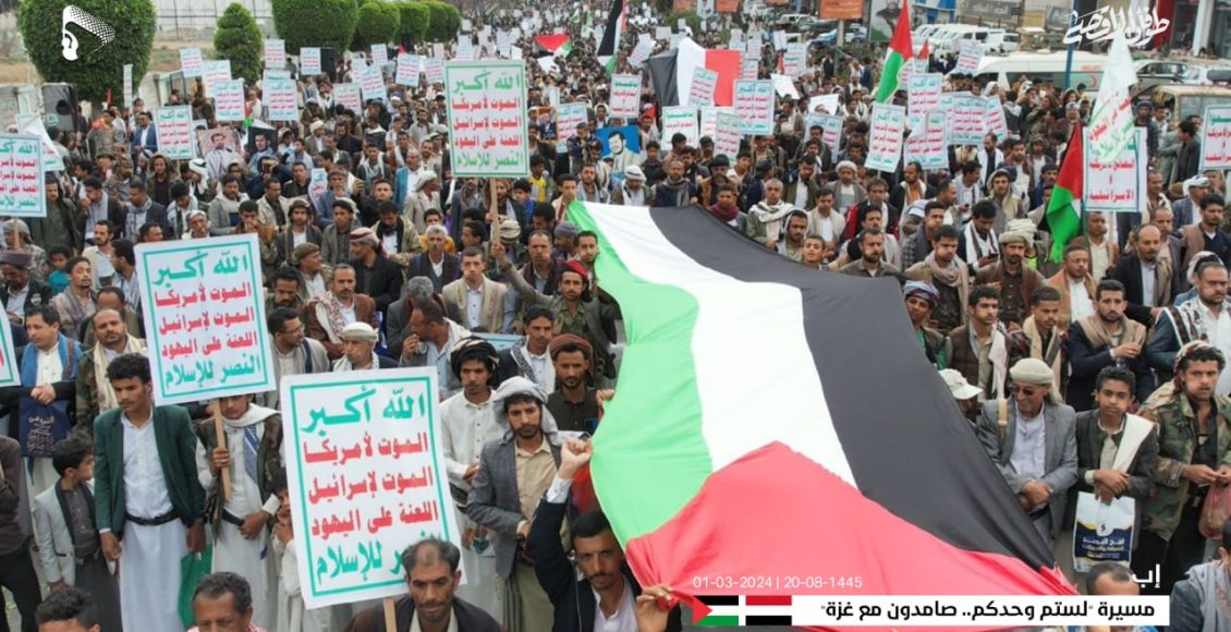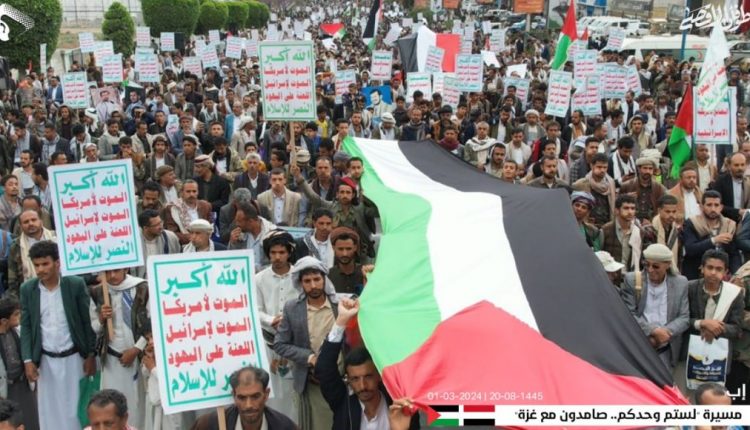 ورفع المشاركون في المسيرتين بمشاركة عدد من أعضاء مجلسي النواب والشورى العلمين اليمني والفلسطيني، مرددين الهتافات المنددة بجرائم الإبادة والتجويع التي يرتكبها الكيان الصهيوني بحق الشعب الفلسطيني بدعم أمريكي غربي.