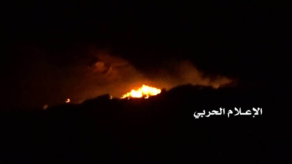 وتظهر المشاهد الليلية عملية تصاعد ألسنة اللهب إثر انفجارات مخازن الأسلحة السعودية بعد استهدافها بقذائف المدفعية.
