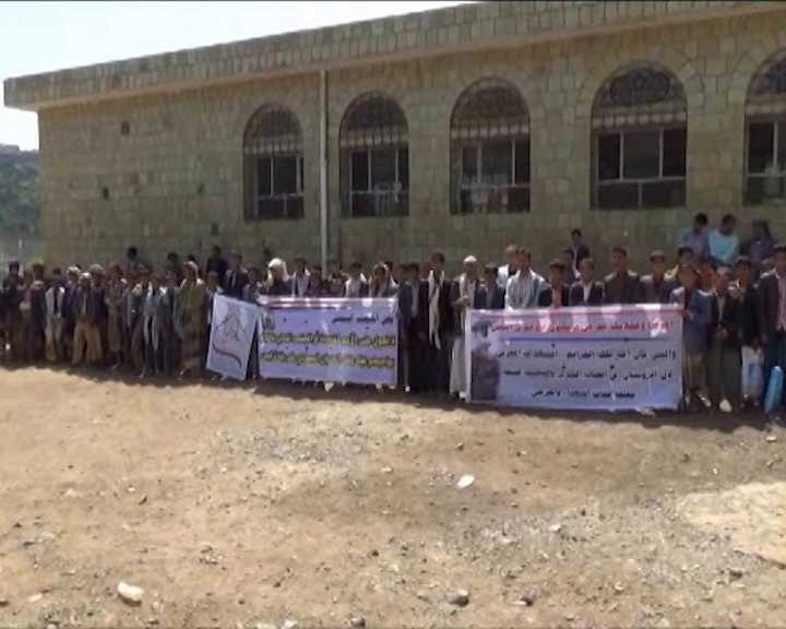 كما نظمَ طلابُ ومدرسو مدرسةِ الثورة ِالثانويةِ بمديريةِ المحابشةِ وقفةً احتجاجيةً تنديدًا باستمرارِ جرائمِ العدوانِ السعوديِّ الامريكي واستهدافِ الصالةِ الكبرى.