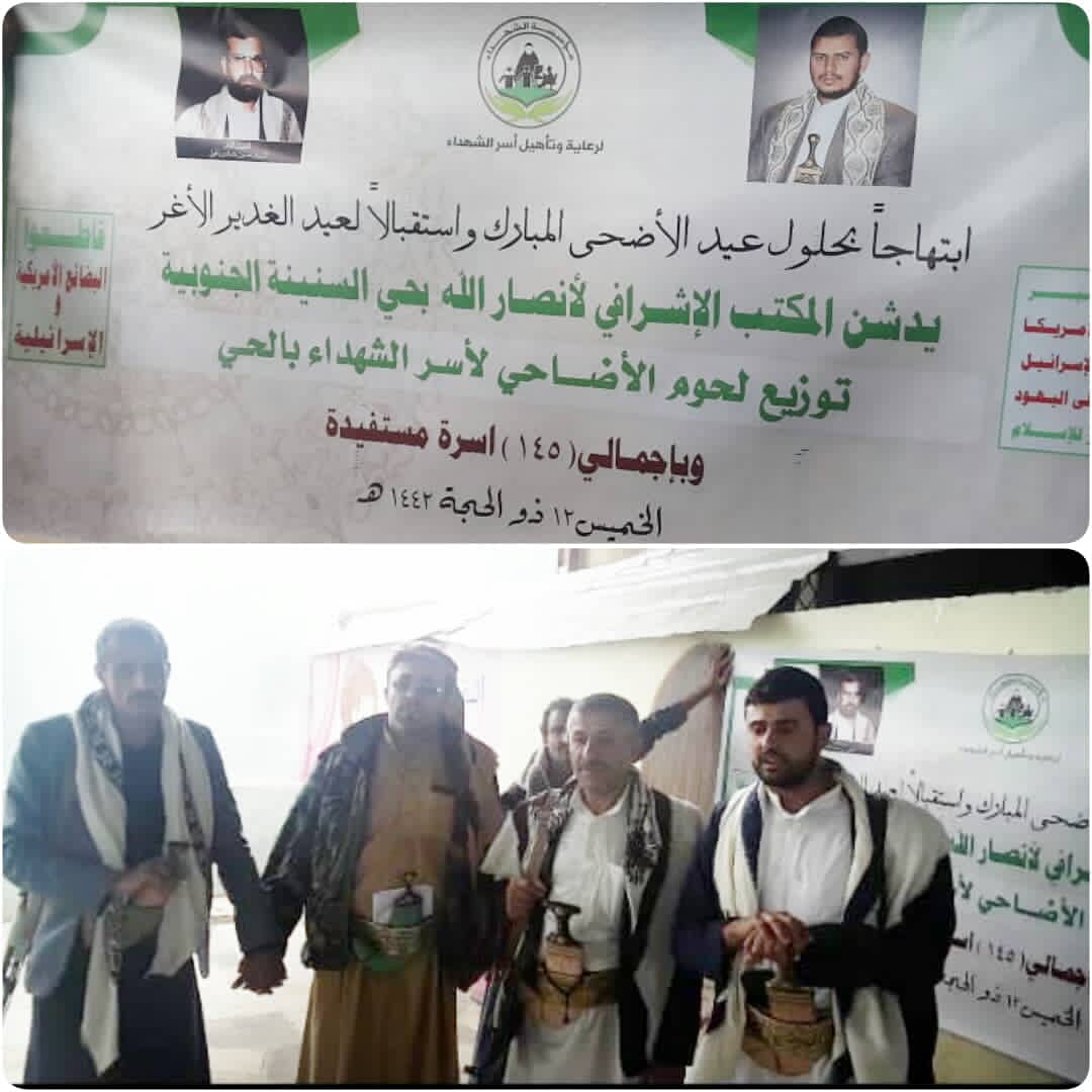 وهنأ الأستاذ محمد هاشم القديمي مندوب الشهداء بالحي أسر الشهداء بحلول عيد الأضحى المبارك وذكرى يوم الولاية ، موضحا أن عدد الأسر المستفيدة من توزيع لحوم الأضاحي هي 145 أسرة من أسر الشهداء الكرماء.