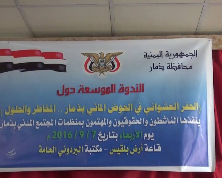 عُقد اليوم بمحافظة ذمار ندوة نوقش فيها أضرار الحفر العشوائي المستقبلية للمياه على الأجيال القادمة. الندوة التي نظمها عدد من الناشطين والحقوقيين والمهتمين بقضايا المجتمع.