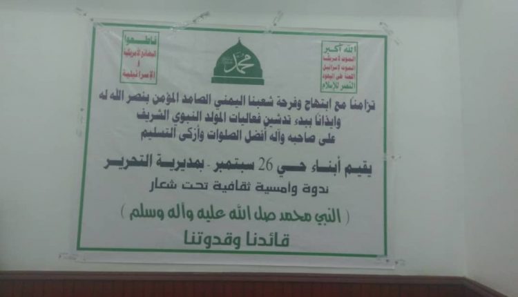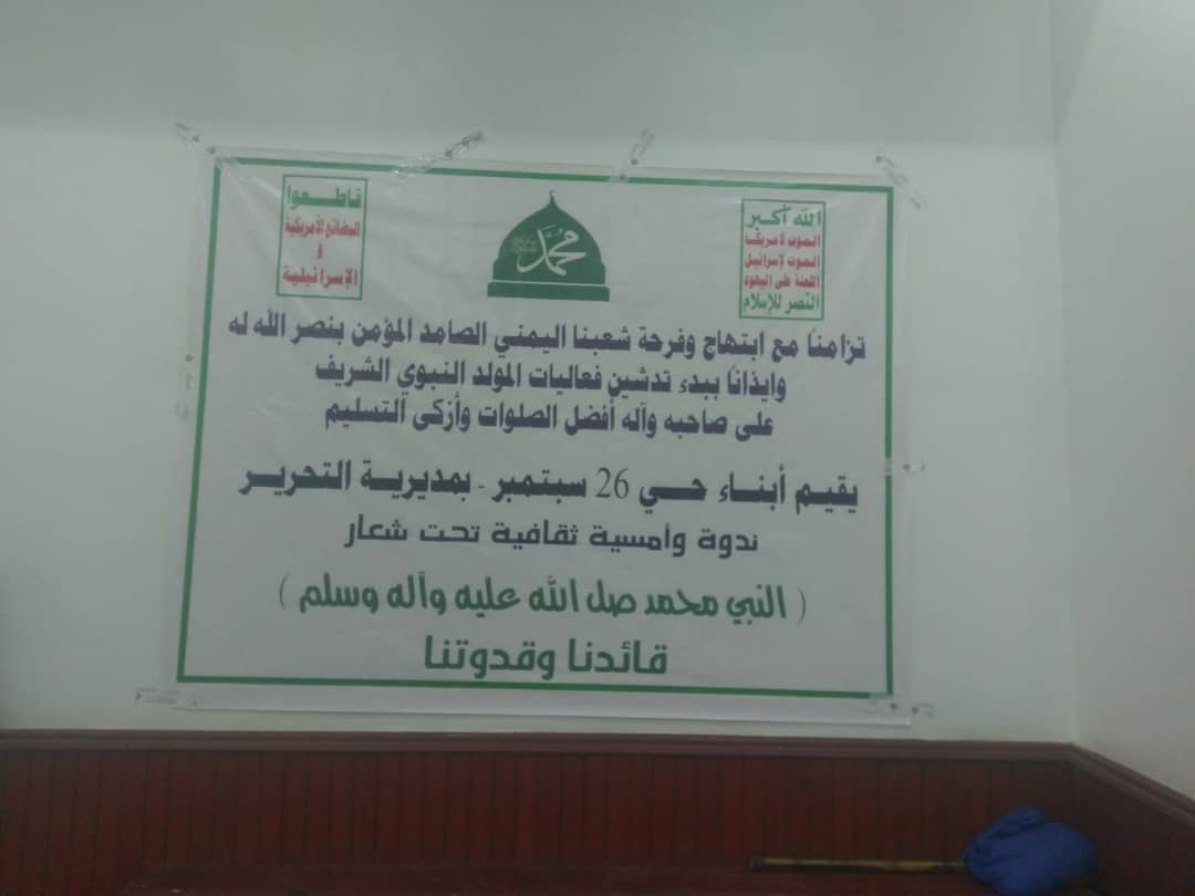 تزامنا مع ابتهاج وفرحة شعبنا اليمني الصامد المؤمن بنصر الله له وايذانآ ببداء تدشين فعاليات المولد النبوي الشريف في الاحياء والحارات لمديرية التحرير.                        اقام ابناء حي 26 مساء اليوم ندوة بمناسبة المولد النبوي بين صلاتي المغرب والعشاء وقد تطرق فيها المتحدثين عن حياة الرسول قبل الرسالة ومن بعد الرسالة والقى العلامة احمد الخزان محاضرة مهمة عن مناصرة اهل اليمن للرسول الاعظم من اول الرسالة الى يومنا هذا وبعد صلاة العشاء اقيمة امسية  في ميدان التحرير عن هذة المناسبة بدات بالقران الكريم للاستاذ عبدالله غدر وبعد القران الكريم عرض فلاشة عن الاحتفالات السابقة  حول مناسبة المولد وحول مواجهه العدوان والقاء الاستاذ عبد الله غدر كلمة الضيوف وبعدها تم عمل مسابقة حول مناسبة المولد الشريف.