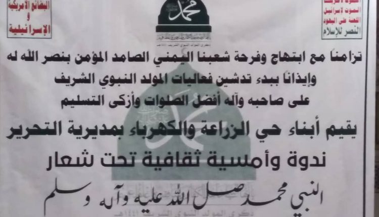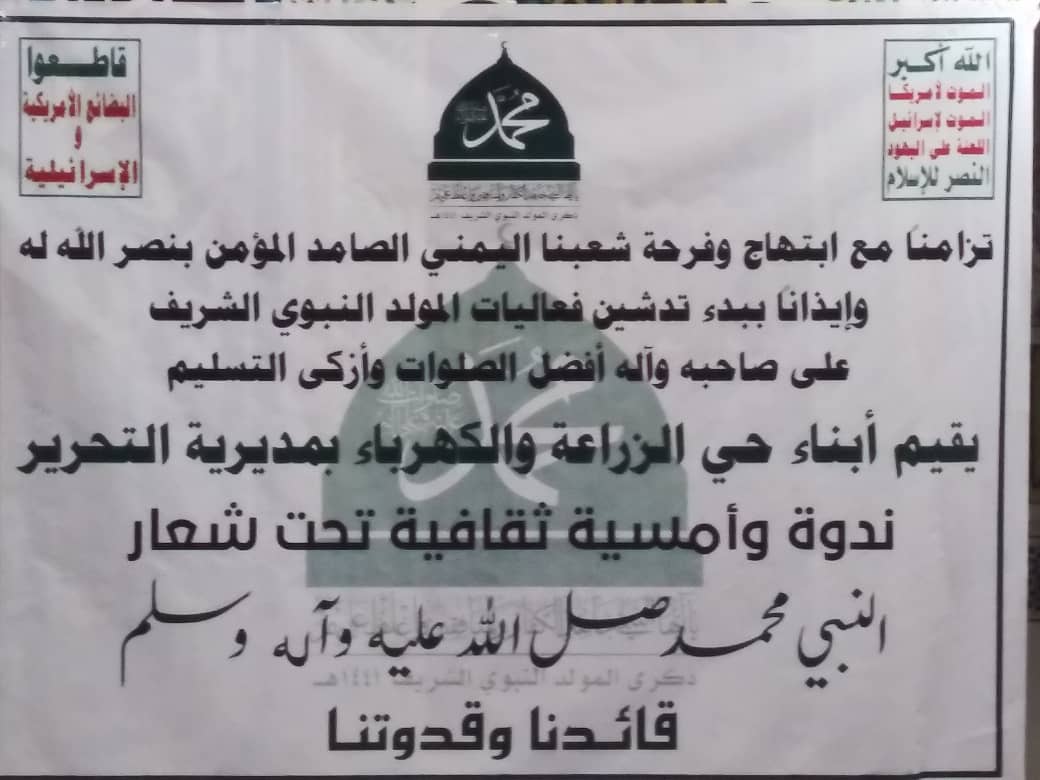 تزامناً مع ابتهاج وفرحة شعبنا اليمني الصامد المؤمن بنصر الله له وايذاناً ببدء تدشين فعاليات المولد النبوي الشريف في الاحياء والحارات لمديرية التحرير.