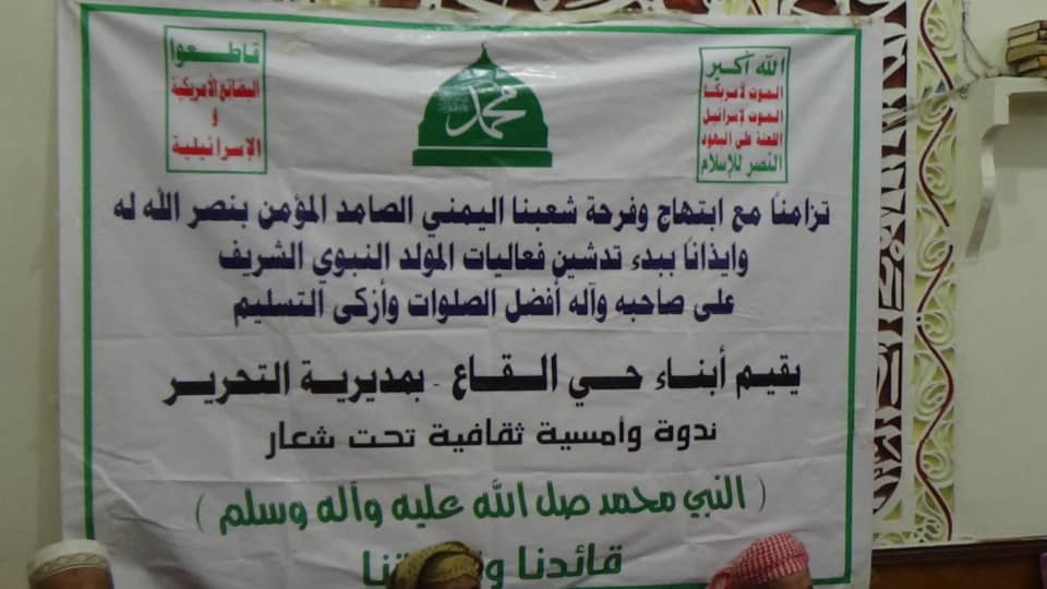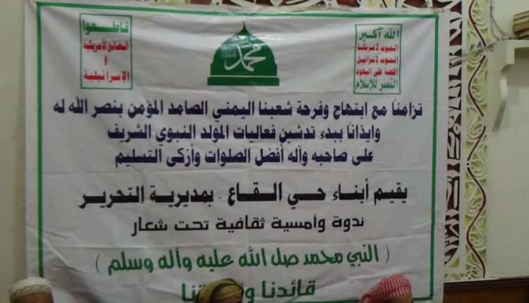 تزامنا مع ابتهاج وفرحة شعبنا اليمني الصامد المؤمن بنصر الله له وايذانا ببدء تدشين فعاليات المولد النبوي الشريف في الاحياء والحارات لمديرية التحرير. اقام ابناء حي القاع مساء اليوم ندوة بمناسبة المولد النبوي بين صلاتي المغرب والعشاء في جامع العاضي وقد تطرق فيها المتحدثين الاستاذ عبد الملك الحليلي والاستاذ وليد الجبل عن حياة الرسول قبل الرسالة ومن بعد الرسالة. وبعد صلاة العشاء اقيمة امسية عن هذة المناسبة بداءت بالقران الكريم للطالب محمد علي وبعد القران الكريم عرض فلاشة عن الاحتفالات السابقة حول مناسبة المولد وحول مواجهه العدوان والقى الاستاذ محمد البدري كلمة الضيوف وبعد كلمة الضيوف وكذلك قدمة فرقة القاع تمثيلية عن المولد النبوي وبعدها تم عمل مسابقة حول مناسبة المولد الشريف وتقديم جواز رمزية أثناء المسابقة.