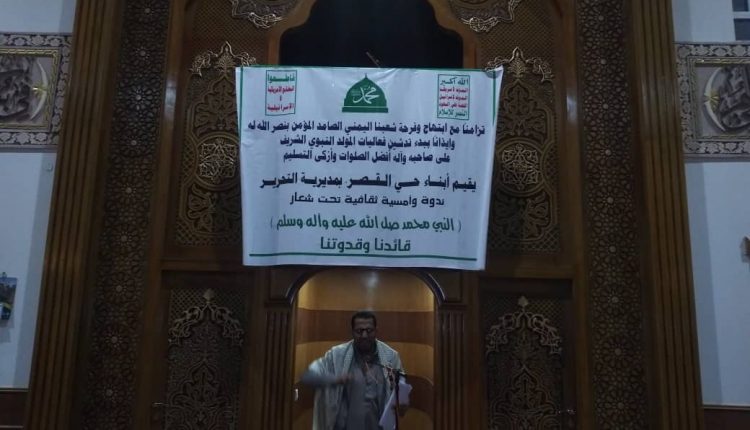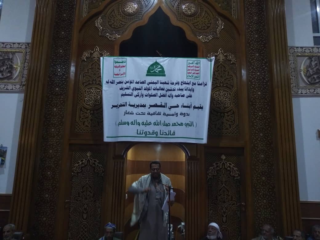 تزامنآ مع ابتهاج وفرحة شعبنا اليمني الصامد المؤمن بنصر الله له وايذانآ ببداء تدشين فعاليات المولد النبوي الشريف في الاحياء والحارات لمديرية التحرير.                        اقام ابناء حي القصر  مساء اليوم ندوة بمناسبة المولد النبوي بين صلاتي المغرب والعشاء في جامع البهمة وقد تطرق فيها المتحدثين الاستاذ محمد الاسطى والاستاذ وليد الجبل عن حياة الرسول قبل الرسالة ومن بعد الرسالة.   وبعد صلاة العشاء اقيمة امسية عن هذة المناسبة بدات بالقران الكريم   وبعد القران الكريم للاستاذ عبدالله غدر وبعد القران تم عرض فلاشة عن الاحتفالات السابقة  حول مناسبة المولد وحول مواجهت العدوان  وبعد كلمة الضيوف قدمة فرقة القصر نشيد روحني عن المولد النبوي وكذلك قدمة فرقة القصر تمثيلية عن المولد النبوي وبعدها تم عمل مسابقة حول مناسبة المولد الشريف وتقديم جواز رمزية أثناء المسابقة.