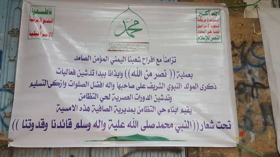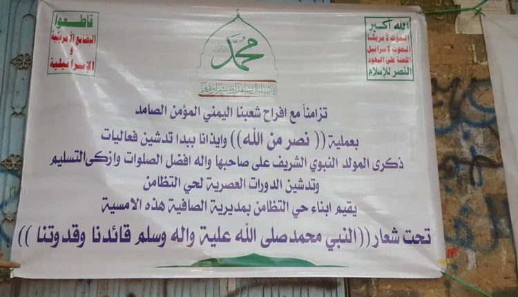 تتواصل احتفالات ابناء مديرية الصافية بمناسبة قدوم ذكرى المولد النبوي الشريف وبالعملية الكبرى في نصر من الله حيث اقام ابناء حي التضامن بمديرية الصافية امسية ثقافية وفنية تضمنت عدد من الفقرات التي نالت احسان الحاضرين تضمنت الامسية الافتتاحية وكانت خير كلام انزل ع خير نبي ارسل وهي ايات من الذكر الحكيم تبعها كلمة ترحيبة اكد فيها ع اهمية الاحتفال بالمولد النبوي لما له دور كبير في تزكية النفوس ولها عوامل الخير الكثيره.  تبعها كلمة للمديرية القاها فايز جابر اكد على الاستعداد للمناسبة التي تعني الكثير للشعب اليمني وشدد على اهمية الحشد للمناسبة والتجيهز لها  كما نقل تهاني المديرية للقياده السياسية وللقائد الثورة بالانتصارات العظيمة في عملية نصر من الله.   تبعها كلمة الضيف والذي القاها أحمد المهدي الذي شدد على اهمية السير على منهج رسول الله وان الاحتفال بمولده واجب وليس بدعه كما يسمونه الذين يحتفلون ويتولوا اليهود والنصارى وان رسول الله هو منا من انفسنا كما قال الله تعالى ( رسول من انفسكم ) وان المولد لاياتي بعده الا خير ونصر من الله كما هناء الحاضرين بالعملية الكبري عملية نصر من الله ودعاء الحاضرين الي الالتحاق بالدورات لما لها من دور كبير في قصم ظهر العدوان كما اختتمت الامسية بعرض لمشاهد عملية نصر من الله عبر البرجركتر . حضر الامسية متابع الحي والمشرف الاجتماعي بالمديرية وعضو الهيئة الوطنية بالمديرية ومندوب القوى البشرية  وعدد من متابعي الحارات وعقال الحارات  وابناء الحي من الشخصيات الاجتماعية