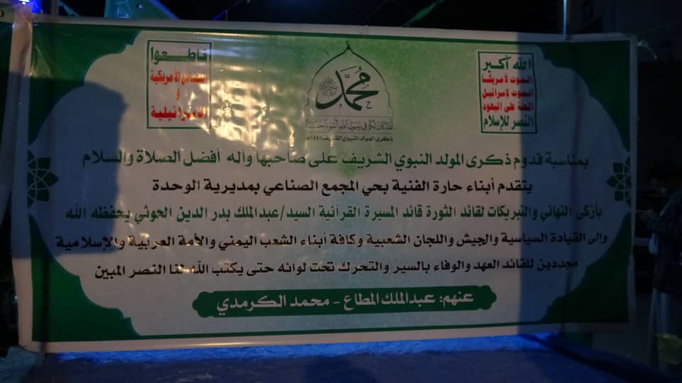 ابنا حارة الفنية بمديرية الوحدة يقيمون امسية احياء وابتهاجا بقدوم ذكرى مولد الرسول الأعظم محمد صلى الله عليه وآله وسلم.