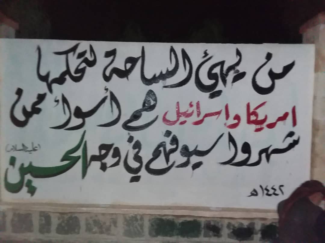 فقد تم كتابة العبارات المخطوطة على جدران الأبنية والشوارع وبشكل ملحوظ والتي توضح مظلومية الإمام الحسين عليه السلام.