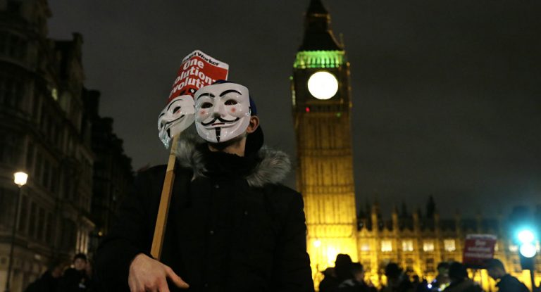 وبدأ آلاف من أنصار حركة القراصنة “أنونيموس” مرتدين أقنعة “غاي فوكس” المسيرة من ساحة ترافالغار وتوجهوا إلى مبنى البرلمان.