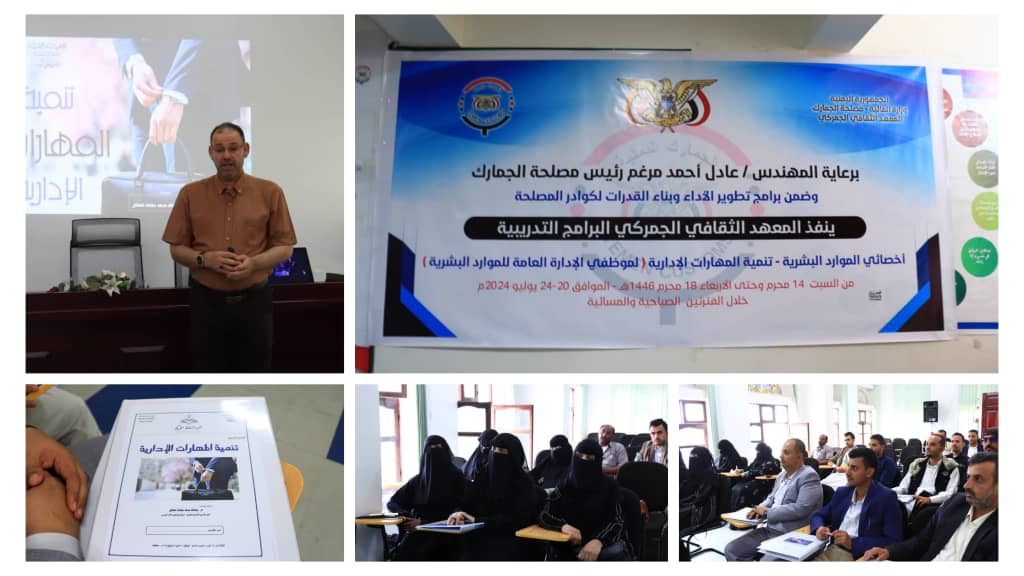 أقيم في المعهد الثقافي الجمركي اليوم السبت ١٤محرم الموافق ٢٠يوليو ٢٠٢٤م برعاية كريمة من المهندس عادل أحمد مرغم رئيس مصلحة الجمارك ضمن برنامج تطوير الأداء وبناء القدرات لكوادر المصلحة من موظفي الإدارة العامة للموارد البشرية .