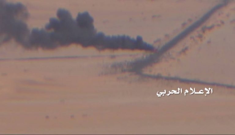 وفي مشهد آخر يظهر طقم عسكري تابع للمرتزقة وقد تم تدميره وقتل طاقمه بصاروخ موجه وبجواره عدد من الأطقم العسكرية.