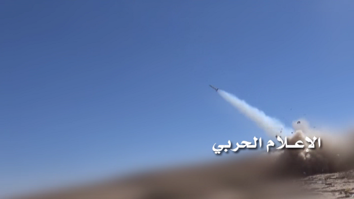 الإعلام الحربي يوزع مشاهد لإطلاق صاروخين من نوع زالزال2 في الجوف.