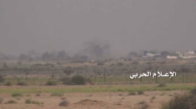 وفي مشهد آخر أظهر عملية قصف معسكر لمرتزقة العدوان شمال صحراء ميدي والذي يحوي مخيماتٍ لاستقبال وتدريب المرتزقة التي تدفع بهم السعودي إلى معارك المواجهة في صحراء ميدي.