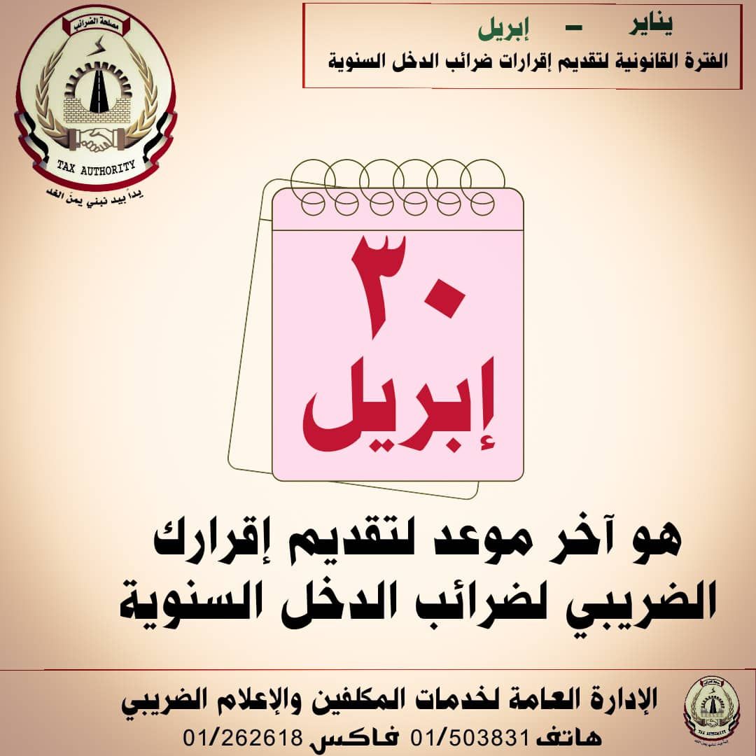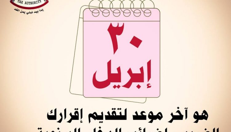 الادارة العامة لخدمات المكلفين والاقرار الضريبي تقر 30ابريل اخر موعد لتقديم الاقرار الضريبي On أبريل 13, 2022 Share Share FacebookTwitterGoogle+ReddItWhatsAppPinterestEmail