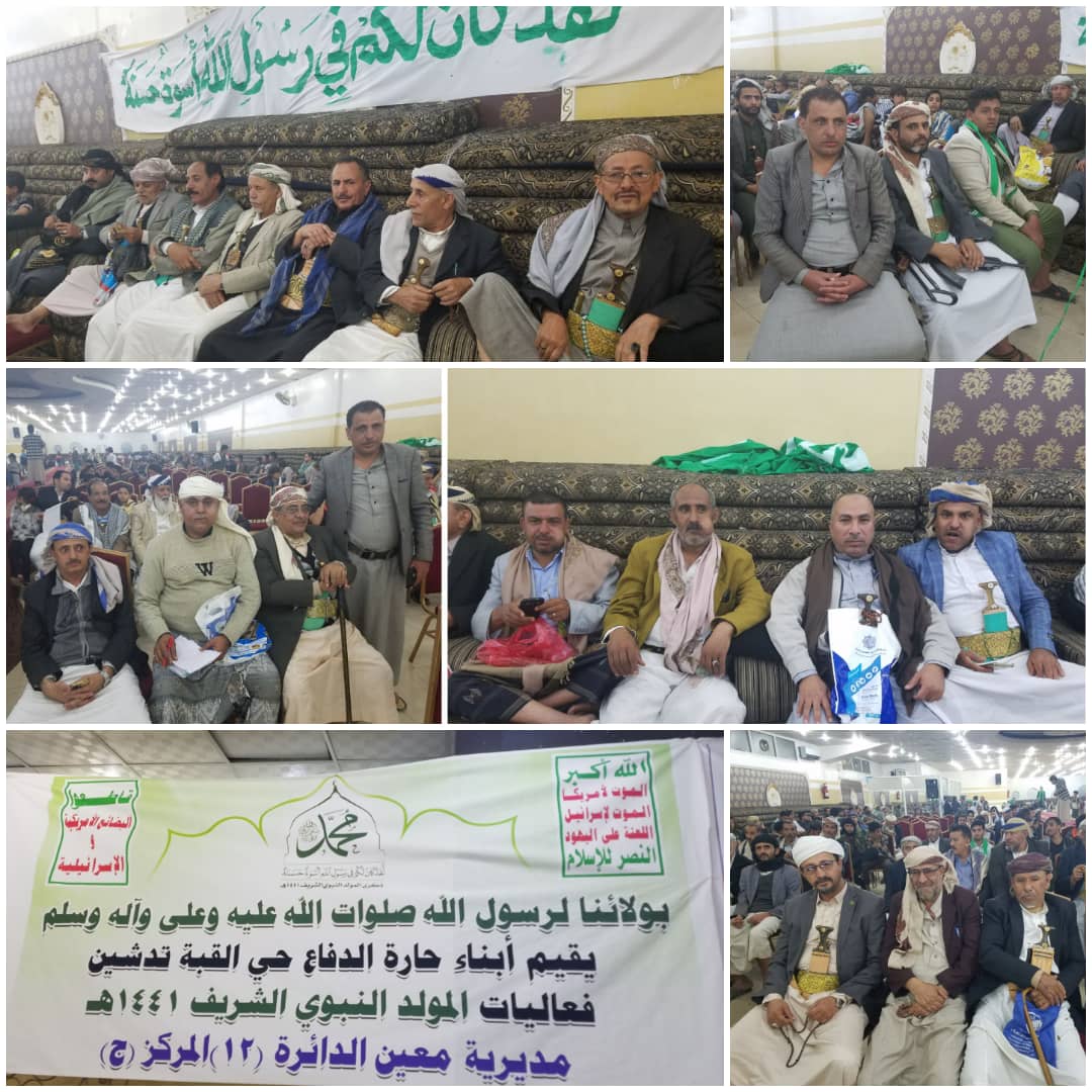 أقام أبناء ووجهاء وعاقل حارة الدفاع بالمركز ( ج ) الدائرة الثانية عشر بحي القبه وبرعاية كريمة من الشيخ منصور الشقاقي عاقل حارة الدفاع والمكتب الإشرافي لإنصار الله بمديرية معين والمركز وبحضور رسمي وشعبي متميز يتقدمهم الأستاذ فهمي اليوسفي نائب وزير الإعلام والشيخ صالح الخولاني وكيل وزارة الأوقات والأستاذ سامي شرف الدين مدير عام التشريعات القانونية بأمانة العاصمة مشرف عام المديرية والشيخ يحيى إسماعيل الشاحذي الأمين العام للمجلس المحلي والدكتور قيس الطل مديرالارشاد والمساجد والشيخ تركي السياغي عضو المجلس المحلي والشيخ محمد رسام مساء يومنا هذا الإثنين الموافق 4 نوفمبر 2019م بقاعة درة الأماكن أمسية احتفالية رائعة بذكرى مولد الرسول الأعظم صلوات الله وسلامه عليه وآله وسلم . وخلال الأمسية التي بدأت بالنشيد الوطني ثم بآيات من الذكر الحكيم ألقيت عدداً من الكلمات التي أوضحت أن الاحتفال بالمولد النبوي يعكس مدى حب اليمنيين للرسول عليه الصلاة والسلام ، مشيره إلى ضرورة التمسك بمنهج وأخلاق الرسول محمد صلى الله عليه وآله وسلم في معاملات وشؤون الحياة . فيما أكدت على ضرورة وأهمية الاقتداء بالرسول الكريم عليه وعلى آله أفضل الصلاة وأتم التسليم .. وقال “رسالتنا للعالم أن إحتفال أبناء اليمن بمولده إنما هو ارتباط عميق بالنبي العظيم وأخلاقه ومنهجه” ، وحثت أبناء المديرية إلى المشاركة في الفعالية المركزية لإحياء ذكرى المولد النبوي الشريف على صاحبه وآله أفضل الصلاة وأتم التسليم التي ستقام يوم الثاني عشر من ربيع الأول بالعاصمة صنعاء . كما أشادت بالحضور والإعداد والتنظيم الجيد والرائع والمتميز لهذه الأمسية الإحتفالية بذكرى مولد الرسول الأعظم صلوات الله وسلامه عليه وآله وسلم ، متقدمين بالشكر الجزيل لكل من ساهم في الإعداد والتجهيز والمشاركة لإقامة هذه الأمسية وعلى رأسهم الشيخ بندر منصور الشقاقي سائلين المولى عز وجل أن يكتبها في ميزان حسناتهم . تخلل الأمسية تقديم عدداً من الفقرات الإنشائية والشعرية الرائعة التي نالت إعجاب واستحسان الحاضرين . حضر الفعالية كلا من العميد شرف عبدالله الوريث مدير عام شؤون الأحياء بأمانة العاصمة والقاضي محمد الفلاحي عضو المجلس المحلي والشيخ عبدالجليل السنباني عضو المجلس المحلي والشيخ فيصل الشقاقي عضو المجلس المحلي والشيخ محمد حزام العصري شيخ مديرية معين والأستاذ عبدالله عباس مدير الهيئة الوطنية لمواجهة الكوارث والإغاثة الإنسانية والشيخ أحمد صلح مدير شؤون الأحياء بمعين والشيخ علي مرشدالغذيفي شيخ الحي والقاضي عبدالمجيد الورع مشرف حي القبه وعدداً من مشايخ وعقال ووجهاء واعيان مديرية معين .