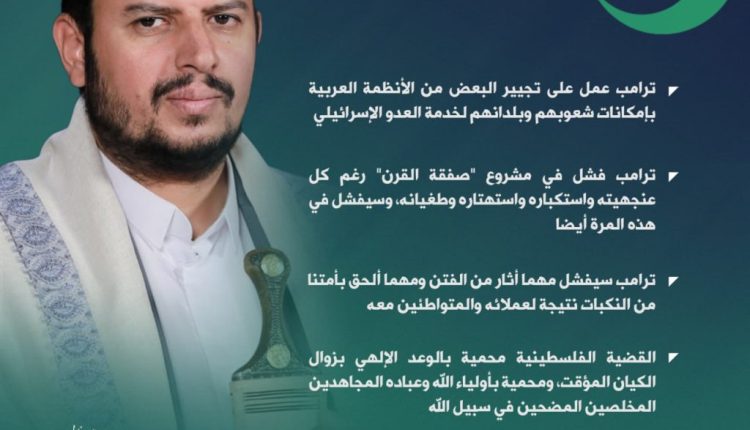 وأوضح السيد أن ترامب عمل أيضاً على تجيير البعض من الأنظمة العربية بإمكانات شعوبهم وبلدانهم لخدمة العدو الإسرائيلي. مؤكدا أن ترامب فشل في مشروع “صفقة القرن” رغم كل عنجهيته واستكباره واستهتاره وطغيانه، وسيفشل في هذه المرة أيضا