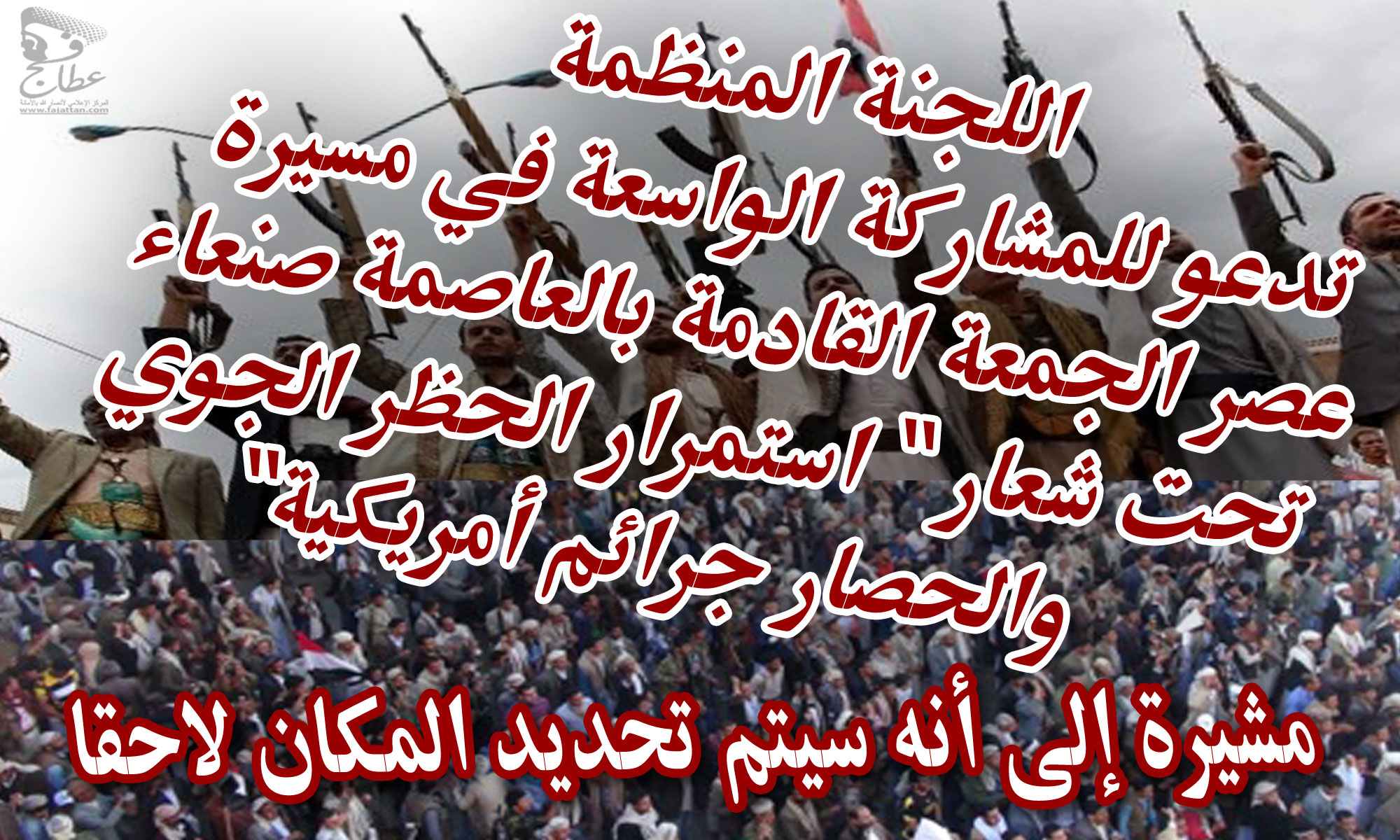 دعت اللجنة المنظمة للفعاليات، أبناء الشعب اليمني إلى المشاركة الواسعة في مسيرة عصر الجمعة القادمة بالعاصمة صنعاء تحت شعار ” استمرار الحظر الجوي والحصار جرائم أمريكية”.