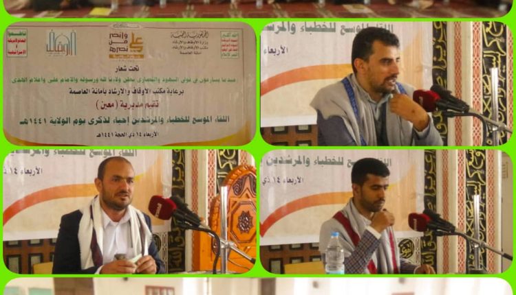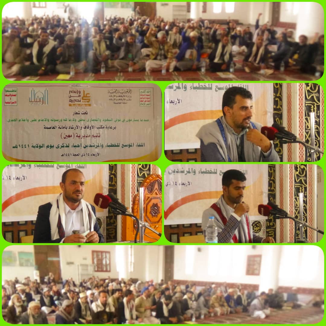 بالتنسيق مع مكتب الأوقاف والإرشاد بالأمانة، نظمت الوحدة الثقافية لأنصار الله بمديرية معين لقاءا موسعا للخطباء والمرشدين بالمديرية إحياءا لذكرى يوم الولاية تحت عنوان ” عندما يسارعون في تولي اليهود والنصارى نعلن ولاءنا لله ورسوله والإمام علي وأعلام الهدى”.