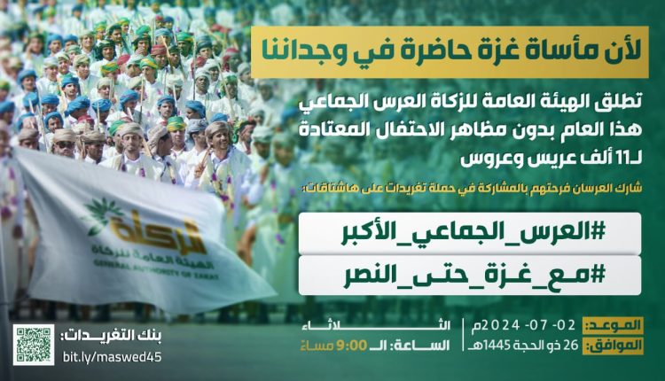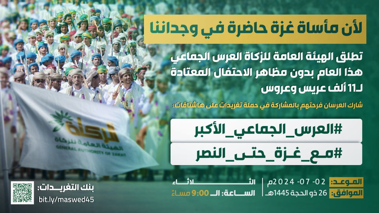 بالتزامن مع تدشين الهيئة العامة الزكاة مشروع العرس الجماعي الرابع لـ11 ألف عريس وعروس، على مستوى أمانة العاصمة والمحافظات غابت عنه في هذا العام في ظرف استثنائي كل مظاهر الاحتفال المعتادة، تنطلق في تمام الساعة التاسعة من مساء اليوم الثلاثاء، حملة تغريدات واسعة، بعنوان ” لأن مأساة غزة حاضرة في وجداننا”.