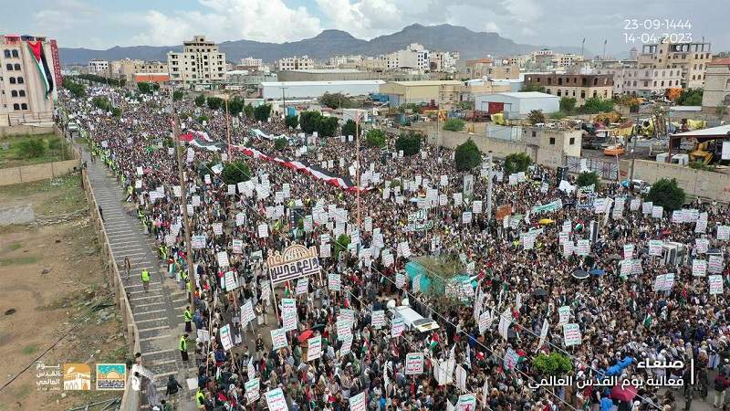 وشهدت العاصمة صنعاء ومحافظات والساحات في صعدة والحديدة وحجة وعمران وذمار وتعز وإب والبيضاء والجوف ومارب والمحويت وريمة والضالع عشرات المسيرات الحاشدة في يوم القدس العالمي.