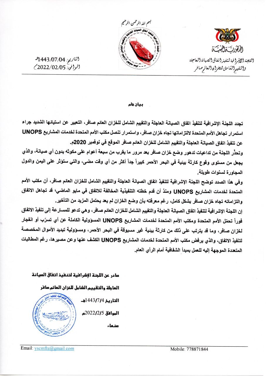 إن اللجنة الإشرافية لتنفيذ اتفاق الصيانة العاجلة والتقييم الشامل للخزان العائم صافر، وهي تدعو للمسارعة إلى تنفيذ الاتفاق فوراً تحمّل الأمم المتحدة ومكتب الأمم المتحدة لخدمات المشاريع UNOPS المسؤولية الكاملة عن أي تسرّب أو انفجار لخزان صافر، وما قد يترتب على ذلك من كارثة بيئية غير مسبوقة في البحر الأحمر، ومسؤولية تبديد الأموال المخصصة لتنفيذ الاتفاق، والذي يرفض مكتب الأمم المتحدة لخدمات المشاريع UNOPS الكشف عنها وعن مصيرها، رغم المطالبات المتعددة الموجهة إليه للعمل بمبدأ الشفافية أمام الرأي العام.