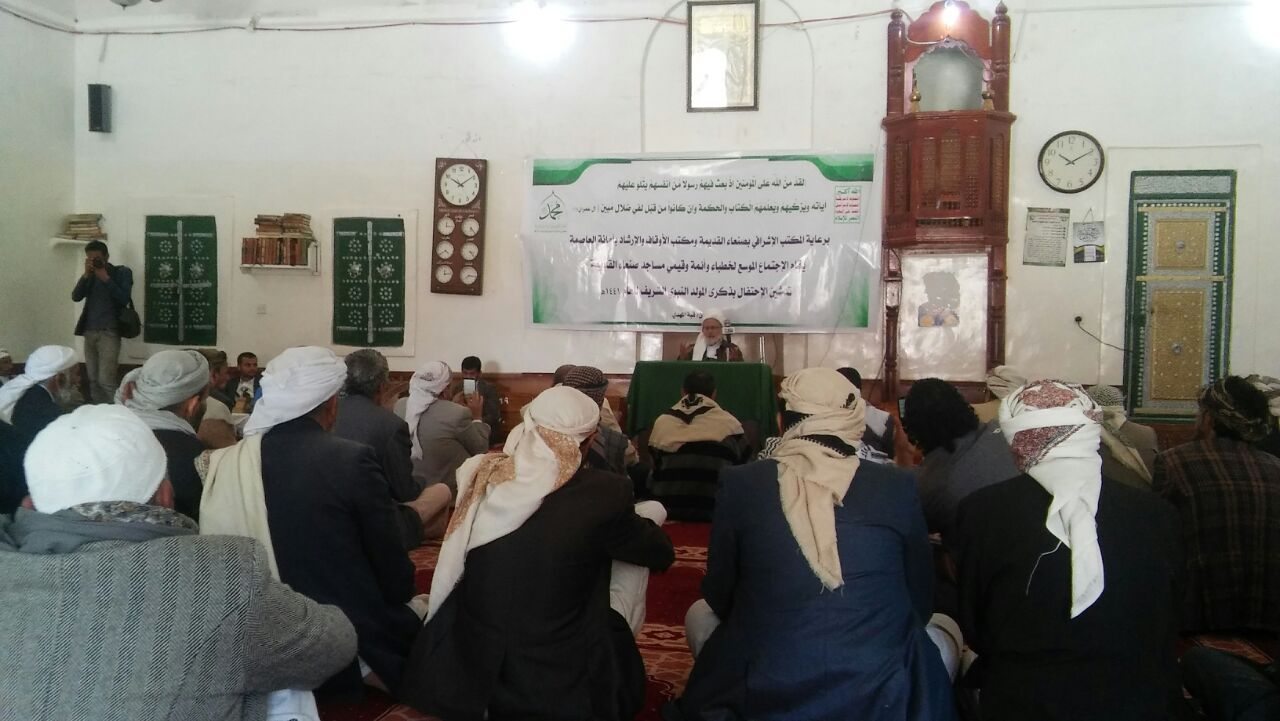 .في صباح الثلاثاء برعاية المكتب الاشرافي بمديرية صنعاءالقديمة أقيم اللقاءالموسع لعلماء وخطباء وأئمة المساجد بالمديرية بمسجد قبه المهدي تدشينا وابتهاجا بقدوم مولد خير البرية صلوات الله عليه وآله حضر اللقاء مشرف عام المديرية والامين العام للمجالس المحلية وكان ضيف هذااللقاء السيدالعلامة المجاهد/ *احمدصلاح الهادي* والذي وضع النقاط على الحروف في كلمته التي اشفت غليل قلوب الحاضرين وحمل الناس جميعا بلا استثناء مسؤولية التحرك الجاد في رفع ذكر مولد النور واختتم اللقاء بصرخات تتردد واصوات تتعالى بلبيك يارسول الله .