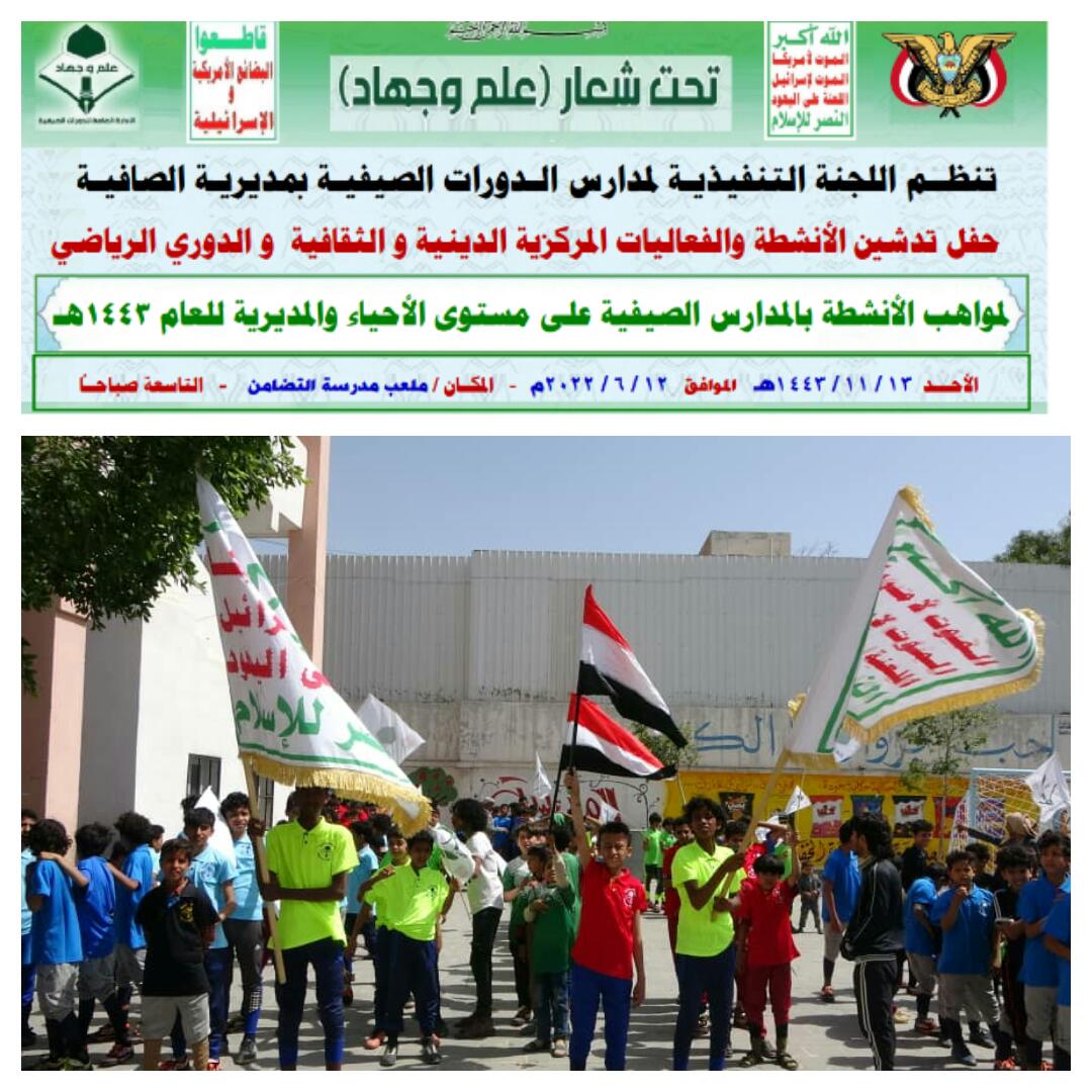 دُشن بمديرية الصافية بالأمانة اليوم فعاليات منافسات الأنشطة الثقافية والرياضية لطلاب ومواهب المدارس الصيفية المفتوحة والمغلقة وانطلاق التصفيات التمهيدية على مستوى مدارس الأحياء ،إستعداد للمنافسات على مستوى المديرية والأمانة .