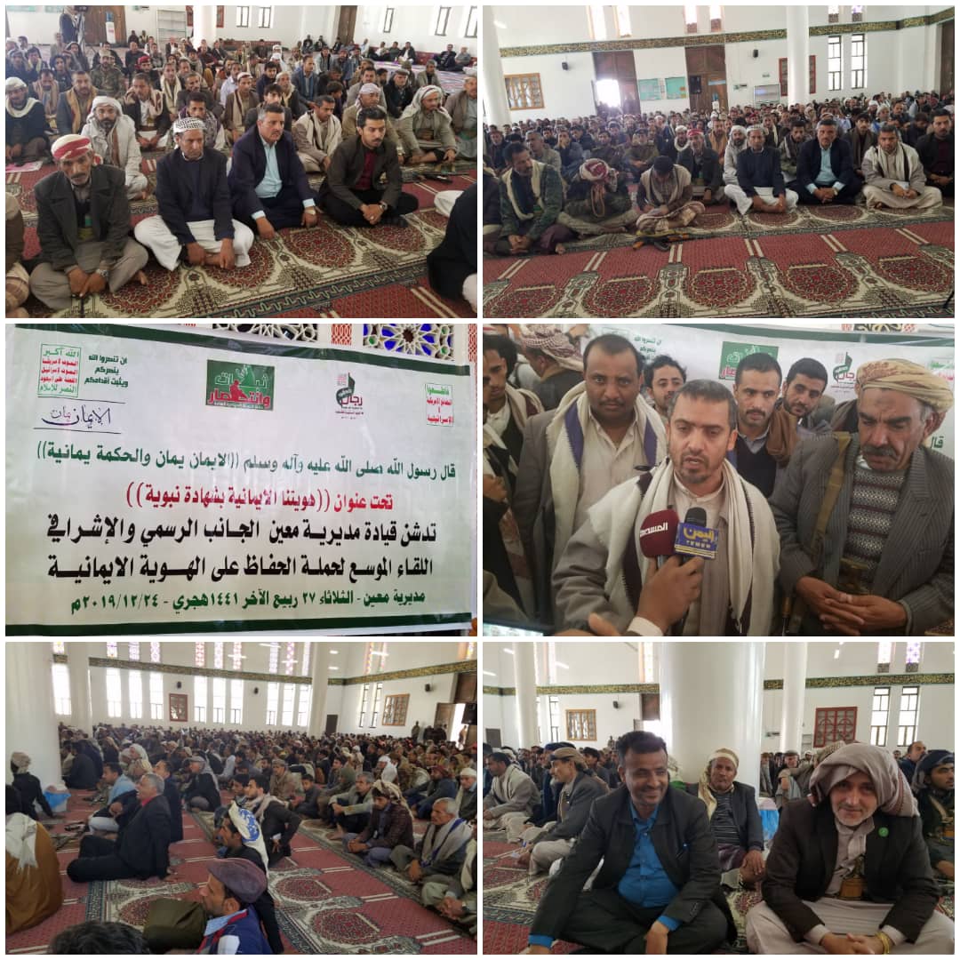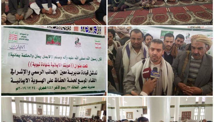 دشنت بمديرية معين بأمانة العاصمة اليوم المرحلة الأولى من برنامج الحفاظ على الهوية الإيمانية تحت شعار “الإيمان يمان .. والحكمة اليمنية”.  وفي التدشين أكد عضو مجلس الشورى خالد المداني، أهمية الحملة الهادفة إعادة الهوية الإيمانية اليمنية وتعزيز الوعي المجتمعي والشبابي بمخاطر الحرب الناعمة التي تشنها دول العدوان على اليمن.  وأشاد بتفاعل الجميع مع الفعاليات والأنشطة التي تعزز من الصمود في مواجهة العدوان سيما في ظل الأوضاع الراهنة التي يمر بها الوطن .. مشيراً إلى ضرورة التحرك لترسيخ الهوية الإيمانية وتعزيز وعي الشباب بمؤامرات العدوان ومخططاته.  ودعا المداني، أبناء وعقال ومشائخ مديرية معين وكافة أبناء مديريات أمانة العاصمة إلى التفاعل وبذل الجهود لإنجاح فعاليات البرنامج بما يكفل الحفاظ على الهوية الإيمانية.  حضر التدشين مدير مديرية معين محمد ناجي، ومدير الشئون القانونية بالأمانة سامي شرف الدين ومدراء المكاتب التنفيذية وأعضاء المجلس المحلي بالمديرية وعدد من المشائخ والعقال والشخصيات الاجتماعية وجمع من المواطنين.
