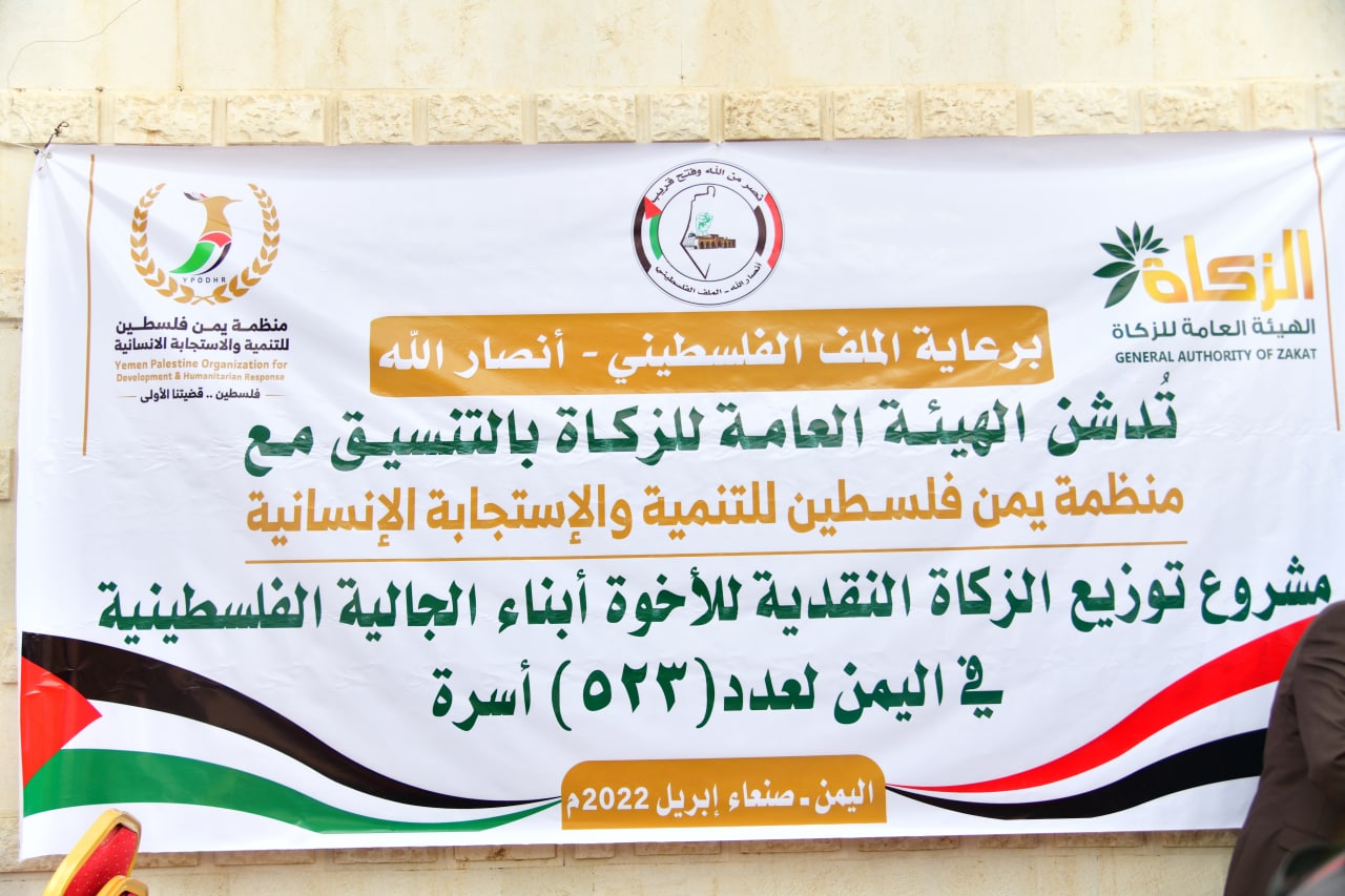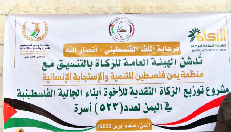 دشنت الهيئة العامة للزكاة بالتنسيق مع منظمة يمن فلسطين للتنمية والاستجابة الإنسانية مشروع توزيع الزكاة النقدية لأبناء الجالية الفلسطينية لـ 523 أسرة بمبلغ 15 مليونا و690 ألف ريال.