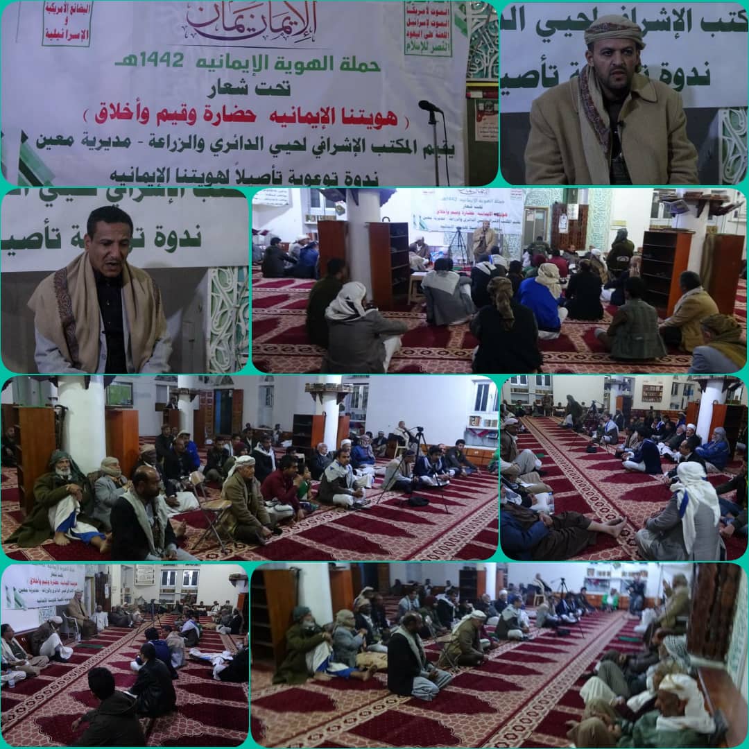 نظم المكتب الإشرافي لأنصار الله بحيي الدائري والزراعة بمديرية معين بصنعاء، مساء اليوم، ندوة ثقافية وتوعوية تحت عنوان هويتنا الإيمانية..حضارة وقيم وأخلاق.