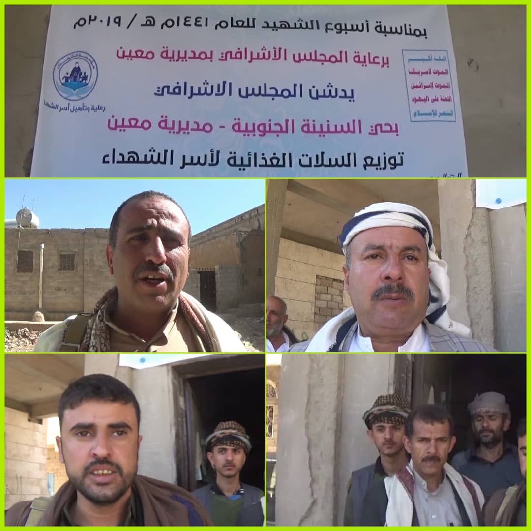 برعاية المكتب الإشرافي لأنصار الله بمديرية معين بالأمانة، تم صباح اليوم تدشين صرف السلات الغذائية لأسر الشهداء بحي السنينة الجنوبية.  وقال الأستاذ محمد الحمزي متابع الحي إن أسر الشهداء والجرحى يستحقون المزيد من الرعاية والإهتمام مقابل تضحياتهم الكبيرة في سبيل الله والدفاع عن الوطن.  من جانبه قال الأستاذ بسام القديمي المشرف الثقافي بالحي إن هذا التدشين يأتي بالتزامن مع الإستعدادات لإحياء الذكرى السنوية للشهيد 1441 هجرية لافتا إلى أن حوالي 130 أسرة شهيد في حي السنينة الجنوبية بمديرية معين سيستفيدون من مشروع صرف السلات الغذائية.  من جانبهم عبر بعض ذوي الشهداء عن شكرهم لهذه اللفتة الكريمة مطالبين مؤسسة الشهداء ببذل المزيد من الجهد لرعاية أسر الشهداء مؤكدين أنهم ماضين على درب الشهداء مهما كانت الصعوبات والتحديات.