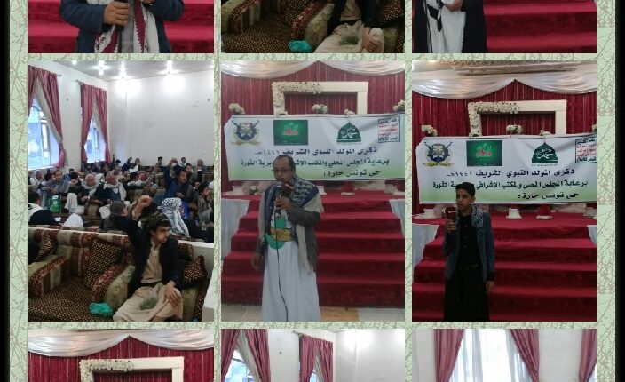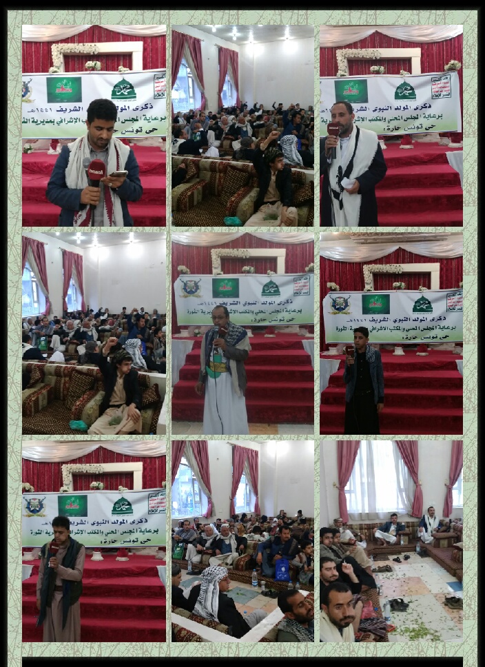 دشنت مديرية الثورة فعاليات اللقاءات في الأحياء والحارات بمناسبة ذكرى المولد النبوي الشريف ١٤٤١ه والذي يقام برعاية المجلس المحلي والمكتب الإشرافي بالمديرية . وأقيمت اليوم الأحد ١٣ / ١٠ / ٢٠١٩م فعالية اللقاء الموسع بحي تونس بحارتي عثرب ووادي فاطمة تدشينا لهذه اللقاءات بهذه المناسبة . وفي اللقاء الموسع الذي حضره عضوي مجلس الشورى اللواء يحي المهدي والمهندس مطهر الجرموزي ووكيل وزارة الأوقاف صالح الخولاني ومدير عام مديرية الثورة محمد حمود الدرواني واجتماعي المديرية العميد هاشم إبراهيم وعلي الكحلاني ومشرف حي تونس عبدالقادر الجرموزي واجتماعي حي تونس وليد الكوكباني. أكد عضو مجلس الشورى اللواء يحي المهدي على أهمية الحشد للفعالية المركزية بذكرى المولد النبوي الشريف إجلالا وإعظاما لهذه المناسبة العظيمة . ودعا إلى أهمية الحفاظ على ديننا وعقيدتنا ونحن نحتفي بمن احتفت به السموات والأرض . وتسائل ألا يحق لنا ان نحتفي بسيد الخلق اجمعين وخاتم النبيين محمد عليه افضل الصلاة والتسليم . واضاف نحن في اليمن نعد مسبقا قبل أن يأتي الثاني عشر من ربيع الأول لاستقبال المولد النبوي الشريف خير استقبال لغظمة هذه المناسبة في الوقت الذي يحتفي فيه النظام السعودي بإستقبال ١٤ ألف جندي أمريكي لحمايتهم ونحن نعرف ماذا أحدثته تلك القوات في البلدان التي دخلتها غير الخراب والدمار ونشر الفجور . من جانبه أشار وكيل وزارة الأوقاف صالح الخولاني إلى أن هذه الظاهرة الإحتفائية بالمولد النبوي الشريف هي دليل واضح على حب اليمنيين ووفائهم للرسول الكريم صلوات الله عليه وعلى آله . وطالب بإحياء هذه المناسبة في أعمالنا إقتداء بخير خلق الله في حياتنا الإجتماعية والإقتصادية والثقافية وغيرها من مختلف جوانب الحياة . وأضاف بأنه لو إقتدى طلابنا وأبنائنا بخاتم الأنبياء والمرسلين لما وصلت الأمة إلى ما وصلت إليه من هذا الخنوع والخضوع والمهانة . مؤكدا في الوقت ذاته على أهمية الحشد للفعالية المركزية وللجبهات بالمال والرجال مشيدا بمديرية الثورة الثائرة ضد الباطل والعدوان والتي لها السبق اليوم في إحياء فعاليات ذكرى المولد النبوي الشريف . من جانبه أكد مدير عام مديرية الثورة محمد حمود الدرواني في تصريح إعلامي على أهمية التجهيز والتحضير للفعالية المركزية لذكرى المولد النبوي الشريف ١٤٤١ه . وأشار إلى أن المجلس المحلي والمكتب الإشرافي نظم برنامج للقاءات الموسعة لذكرى المولد النبوي الشريف في جميع حارات وأحياء المديرية وصولا للفعالية المركزية للمديرية قبيل الفعالية المركزية على مستوى الجمهورية . وأضاف بأن ذلك يأتي من خلال إدراكنا بعظمة هذه المناسبة لدى المسلمين عامة التي على صاحبها أفضل الصلاة والتسليم . ودعى الجميع من أبناء مديرية الثورة إلى الحشد للفعالية المركزية في الثاني عشر من ربيع الأول في حشد غير مسبوق يعكس عظمة وحب اليمنيين لخاتم الأنبياء أمام العالم . منبها إلى أهمية رفد الجبهات بالمال والرجال وهم يسطرون أروع الملاحم البطولية دفاعا عن الأرض والعرض . ورحب محمد محمد مطير بالحاضرين مؤكدا على أهمية الحشد للفعالية المركزية وكذلك للجبهات التي لا تقل أهمية عن المناسبة . و جاء اللقاء احتفاء بمناسبة المولد النبوي الشريف على صاحبه افضل الصلاة وازكى التسليم ، وكذا لمناقشة التحضيرات والإستعدادات الجارية للإحتفال بذكرى المولد في الثاني عشر من ربيع والمشاركة والتجهيز للإحتفال بالمولد النبوي، وبما يعزز من حبه -صلى الله عليه وآله وسلم- والإقتداء بأخلاقه وسيرته ومنهجه. وأكد اللقاء أهمية الإقتداء برسول الله وتقييم واقع الأمة والعودة إلى نهج النبي وفكره وأخلاقه. واستعرض خلال اللقاء السيرة الشريفة لخاتم الأنبياء والمرسلين ودعوته في سبيل الحق وهداية البشرية إلى الطريق المستقيم والتضحية في سبيل الله . وأكد اللقاء على أهمية المضي على نهج القرآن واقتفاء أثر النبي الكريم في الذود والدفاع عن الحق ضد الباطل وأهله . واستمر