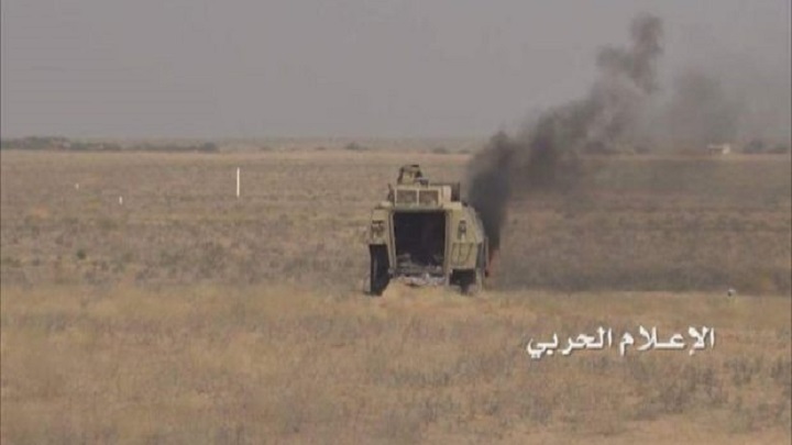 دمر مجاهدو الجيش واللجان الشعبية، اليوم السبت، مدرعة لمرتزقة الجيش السعودي في صحراء ميدي.