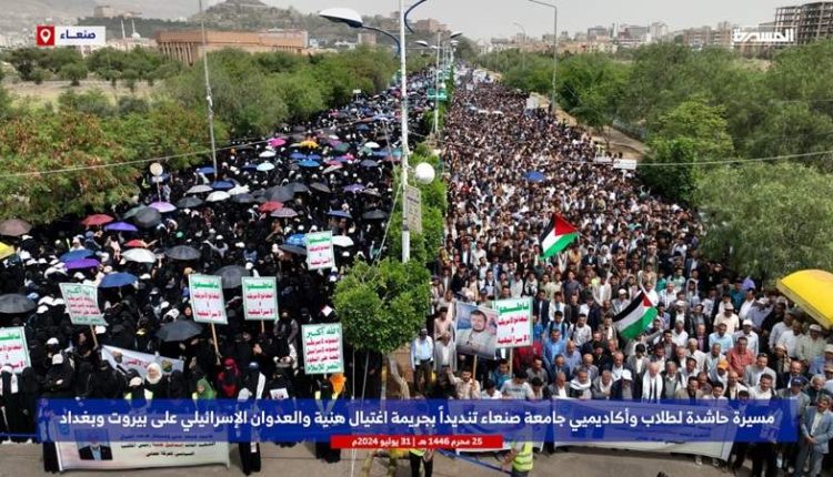 تظاهرة حاشدة لطلاب وأكاديميي جامعة صنعاء تنديدا بجريمة اغتيال هنية والعدوان على العراق ولبنان
