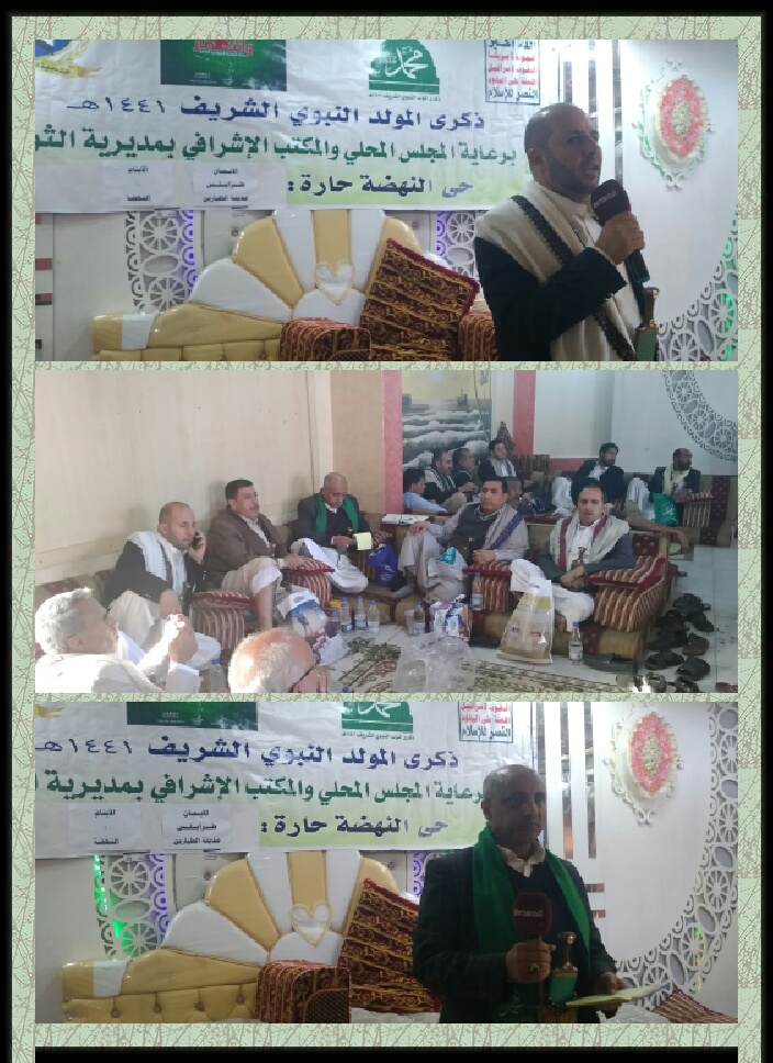 تواصلت بمديرية الثورة الفعاليات الثقافية و اللقاءات الموسعة في الأحياء والحارات بمناسبة ذكرى المولد النبوي الشريف ١٤٤١ه على صاحبه أفضل الصلاة وأتم التسليم والذي يقام برعاية المجلس المحلي والمكتب الإشرافي بالمديرية . وأقيمت اليوم السبت ٢ / ١١ / ٢٠١٩م الموافق ٥ ربيع الأول ١٤٤١ه فعالية ثقافية ولقاء موسع بحي النهضة لحارات الأيتام والطيارين والوحدة وطرابلس والإيمان . والذي حضره عضو مجلس الشورى المهندس لطف الجرموزي وعضو مجلس الشورى أحمد الظفري ونائب رئيس المكتب التنفيذي للرؤية الوطنية الدكتور يحي المحاقري ووكيل وزارة الأشغال الدكتور يحي الشامي ووكيل أمانة العاصمة الشيخ ناجي القوسي ومدير عام مديرية الثورة محمد حمود الدرواني واجتماعي المديرية العميد هاشم إبراهيم وثقافي المديرية خالد سليمان وشيخ المديرية محمد حسين مداعس ومشرف حي النهضة منير المتوكل واجتماعي النهضة لطف الكحلاني وثقافي النهضة هشام الجنيد . و استعرض عضو مجلس الشورى المهندس لطف الجرموزي الكرامات والمعجزات التي رافقت ميلاد رسول الله والتي أظهرت عظمة هذه البعثة العظيمة وإشعارنا بالمسئولية لعظمة الرسول الذي يعتبر محطة جامعة لوحدة المسلمين . ولفت إلى الدور الكبير الذي قدمه أبناء اليمن منذ بداية الدعوة والتي تمثل عظة ودروسا للإقتداء بهم في نصرة دين الله ورسوله صلوات الله عليه وعلى آله . وأكد پأن الدين الإسلامي ربى المسلمين على الروح الجهادية والرسالة الإسلامية رسالة جمعية موحدة للعالم . ودعا الحاضرين للخروج إلى الفعالية المركزية وتحمل المسئولية الملقاة على عاتقنا . وأشار وكيل امانة العاصمة الشيخ ناجي القوسي بأننا على موعد كبير مع مناسبة عظيمة يجب علينا جميعا الحشد لها . واستغرب من أولئك الذين يدعون بأن الاحتفال بهذه المناسبة بأنها بدعة . وأضاف بأننا في خير وسنسير جميعا إلى ميدان السبعين لنحتفل برسول الهدى والذي بعثه الله رحمة لنا وللعالمين . وأكد بأن هذه الفعاليات أعادت للناس روح الإسلام والتي تعد أعظم الناسبات وأكثرها حبا لرسول الله وقال نعول عليكم للحضور الكبير والحشد لهذه المناسبة الكبيرة . وأشار صالح هلال إلى معاني الإهتداء برسول الرحمة والهدى وأهل اليمن شاركوا في كل فتح لأي بلد يدخله الإسلام . ودعا إلى الخروج إلى الفعالية المركزية التي ستقام في الثاني عشر من ربيع الأول . من جانبه أكد مدير عام مديرية الثورة محمد حمود الدرواني في تصريح إعلامي على أهمية التجهيز والتحضير للفعالية المركزية لذكرى المولد النبوي الشريف ١٤٤١ه . وأشار إلى أن المجلس المحلي والمكتب الإشرافي نظم برنامج للقاءات الموسعة لذكرى المولد النبوي الشريف في جميع حارات وأحياء المديرية وصولا للفعالية المركزية للمديرية قبيل الفعالية المركزية على مستوى الجمهورية . وأضاف بأن ذلك يأتي من خلال إدراكنا بعظمة هذه المناسبة لدى المسلمين عامة التي على صاحبها أفضل الصلاة والتسليم . ودعى الجميع من أبناء مديرية الثورة إلى الحشد للفعالية المركزية في الثاني عشر من ربيع الأول في حشد غير مسبوق يعكس عظمة وحب اليمنيين لخاتم الأنبياء أمام العالم . منبها إلى أهمية رفد الجبهات بالمال والرجال وهم يسطرون أروع الملاحم البطولية دفاعا عن الأرض والعرض . وفي الكلمة الترحيبية للفعالية التي قدمها عبداللطيف الهادي والتي أشار إلى ان الفعالية تتزامن مع خمس سنوات على العدوان الغاشم وما تحقق من انتصارات عظيمة بفضل من الله والتي كان آخرها علية نصر من الله . واضاف بأن الاحتفال بهذه المناسبة يعكس عظمة وحب اليمنيين لرسول الله ووفائهم له ولرسالته الألهية . داعيا الجميع الى الخروج إلى الفعالية المركزية والحشد لها . تخلل الفعالية قصيدة شعرية للشاعر الحارث بالفضل اعربت عن حب اليمنيين لرسول الله ونالت استحسان الحاضرين .