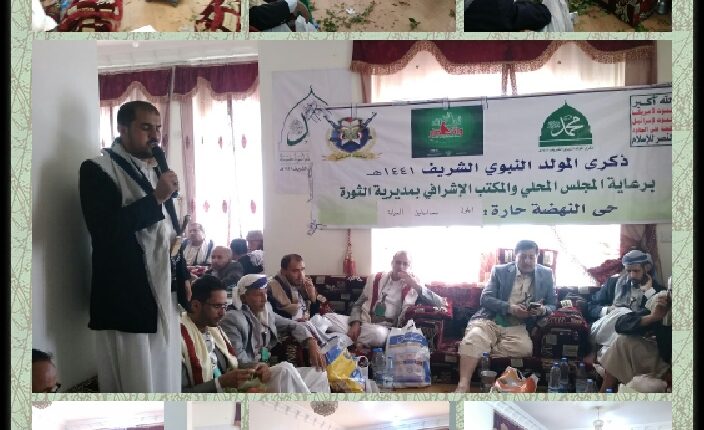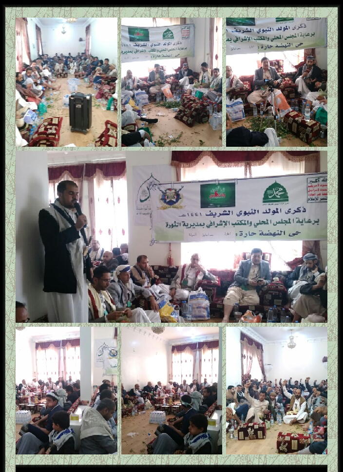 تواصلت بمديرية الثورة الفعاليات الثقافية و اللقاءات الموسعة في الأحياء والحارات بمناسبة ذكرى المولد النبوي الشريف ١٤٤١ه على صاحبه أفضل الصلاة وأتم التسليم والذي يقام برعاية المجلس المحلي والمكتب الإشرافي بالمديرية . وأقيمت اليوم الاثنين ٢٨ / ١٠ / ٢٠١٩م الموافق ٢٩ صفر ١٤٤١ه فعالية ثقافية ولقاء موسع بحي النهضة لحارات أيلول ومحمد إسماعيل والصيانة والذي حضره نائب رئيس المكتب التنفيذي للرؤية الوطنية يحي المحاقري وعضو مجلس الشورى الشيخ أحمد الظفري وعضو مجلس الشورى محمد حفظ الله الزوم ووكيل أمانة العاصمة لقطاع الأحياء الدكتور قناف المراني ومدير عام مديرية الثورة محمد حمود الدرواني ومشرف المديرية القاضي إبراهيم الكبسي واجتماعي المديرية العميد هاشم إبراهيم وثقافي المديرية وعضو المجلس المحلي يحي غيلان ومدير مكتب مدير المديرية إبراهيم القادري ومدير عمليات مديرية الثورة فارس البحم خالد سليمان ومشرف النهضة منير المتوكل واجتماعي النهضة لطف الكحلاني وثقافي النهضة هشام الجنيد . واشار نائب رئيس المكتب التنفيذي للرؤية الوطنية يحي المحاقري بأنه ينبغي علينا أن نكون عند مستوى هذه المناسبة . وأضاف بأن الإحتفال في اليمن بهذه المناسبة يأتي في ظل تعمد تغييب الإحتفال بذكرى المولد النبوي الشريف على صاحبه افضل الصلاة وأتم التسليم . واستعرض كيف تم استهداف الأمة واستعمارها بعدة صور منها الوصاية أو الاحتلال المباشر وما اعقبها من وضع الامة تحت فكر متعصب تعصبا شديد وطرف ينكر الوجود الإلهي مما جعل الامة في صراع ويقتل بعضها البعض . واعتبر احتفال المولد النبوي الشريف يعد أكبر وأهم مناسبة دينية تذكرنا بعظمة رسول الأمة . واستغرب من وصول الأمة إلى مرحلة من الضعف والتفكيك حتى بات الإحتفال بالكرسمس مظهرا رائجا ودول تحتفل بهذا مثل الإمارات وتنفق الملايين من الدولارات عليه . واكد أن قوة الإيمان هي من تجعل من المجاهدين يحققون الإنتصارات الكبيرة منبها بأهمية العودة إلى عقيدتنا وديننا وقيمنا وهنا ستنهض الأمة وسيكون لها مكانتها . بدوره أكد مشرف مديرية الثورة القاضي إبراهيم الكبسي على أهمية احتفال اليمنيين بمولد الرسول صلوات الله عليه وعلى آله وأن هذا الإحتفال ليس من باب الترف بل امتثال لعظمة رسول الله ومكانته . واستغرب من تلك الإدعاءات التي تقول بأن الإحتفال بالمولد النبوي الشريف بدعة . وقال نحن كيمنيين علينا مسئولية عظيمة ملقاة على عاتقنا التي أوصانا بها الرسول ونحن اليوم نواجه هذا العدوان الغاشم والحصار الشديد لخمس سنوات . وأضاف بأن الله سبحانه وتعالى أرسل لنا القرآن الكريم رحمة والرسول الكريم رحمة وبالتالي علينا أن نحمد الله على رحمته بنا . وأشار إلى عظمة اليمنيين الناتجة من ارتباطهم بالله وبرسوله وهو ما حول المجاهدين إلى قوة إيمانية تمكنت من تدمير اسطورة السلاح الأمريكي وحرق دباباته الإبرامز . ودعا الجميع إلى الحشد للفعالية المركزية في الثاني عشر من ربيع الأول كرسالة تعبر عن عدم تفريط اليمنيين بدين الله ولا برسوله الأعظم . من جانبه أكد مدير عام مديرية الثورة محمد حمود الدرواني في تصريح إعلامي على أهمية التجهيز والتحضير للفعالية المركزية لذكرى المولد النبوي الشريف ١٤٤١ه . وأشار إلى أن المجلس المحلي والمكتب الإشرافي نظم برنامج للقاءات الموسعة لذكرى المولد النبوي الشريف في جميع حارات وأحياء المديرية وصولا للفعالية المركزية للمديرية قبيل الفعالية المركزية على مستوى الجمهورية . وأضاف بأن ذلك يأتي من خلال إدراكنا بعظمة هذه المناسبة لدى المسلمين عامة التي على صاحبها أفضل الصلاة والتسليم . ودعى الجميع من أبناء مديرية الثورة إلى الحشد للفعالية المركزية في الثاني عشر من ربيع الأول في حشد غير مسبوق يعكس عظمة وحب اليمنيين لخاتم الأنبياء أمام العالم . منبها إلى أهمية رفد الجبهات بالمال والرجال وهم يسطرون أروع الملاحم البطولية دفاعا عن الأرض والعرض . وأشار أحمد جحاف في كلمته الترحيب