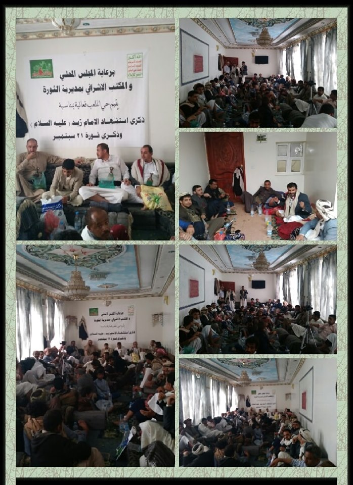 تتواصل بمديرية الثورة فغاليات إحياء ذكرى استشهاد الإمام زيد عليه السلام والذكرى الخامسة لثورة ٢١ سبتمبر والتي تقام برعاية المجلس المحلي والمكتب الإشرافي بالمديرية .
