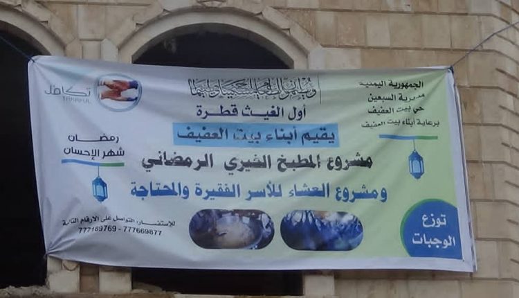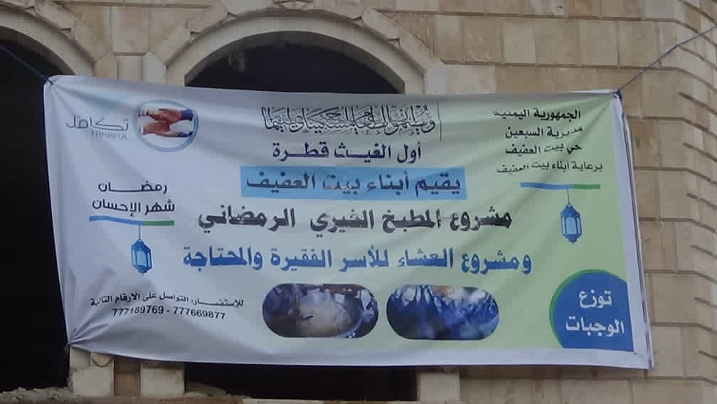 مطبخ خيري بحي بيت العفيف بمديرية السبعين يقدم وجبات غذائية للاسر الفقيرة طيلة شهر رمضان المبارك .